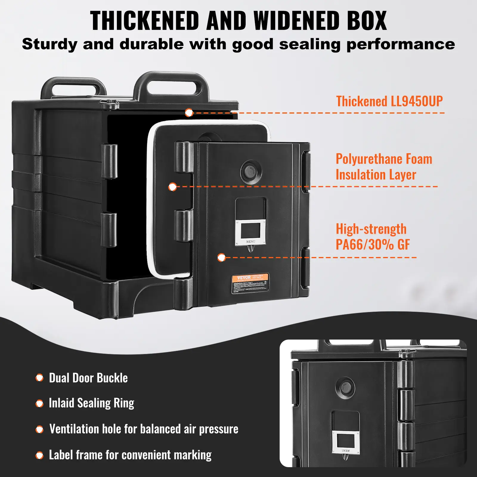 • Sturdy & Durable: Made from high-quality materials, the thickened design of the box is strong and impact-resistant. The large, robust buckles securely lock the door and create a seal to maintain hot or cold food.