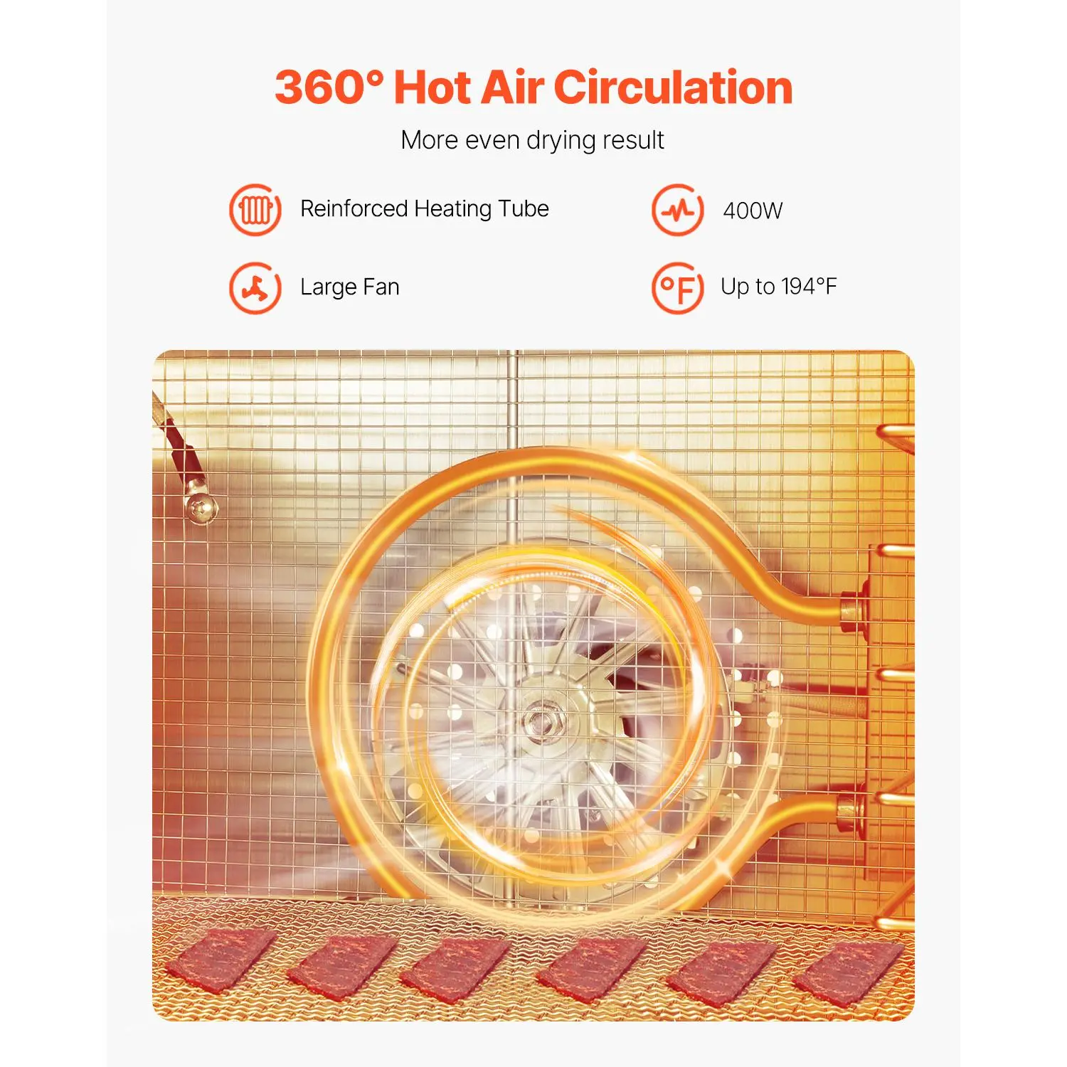 ·Efficient & Even Drying: With an upgraded thickened heating tube and large fan, the heating tube generates heat while the fan circulates the warm air inside, evenly penetrating the food. The food dehydrator machine ensures even drying while preserving nutrients without loss