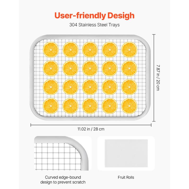 • Edge-bound Trays: The beef jerky dehydrator machine comes with eight 304 stainless steel trays (11.02 x 7.87 in / 28 x 20 cm) for direct contact with food with peace of mind. The upgraded curved edge-bound design is smooth, preventing injury to hands, easy to clean, and can support heavy loads