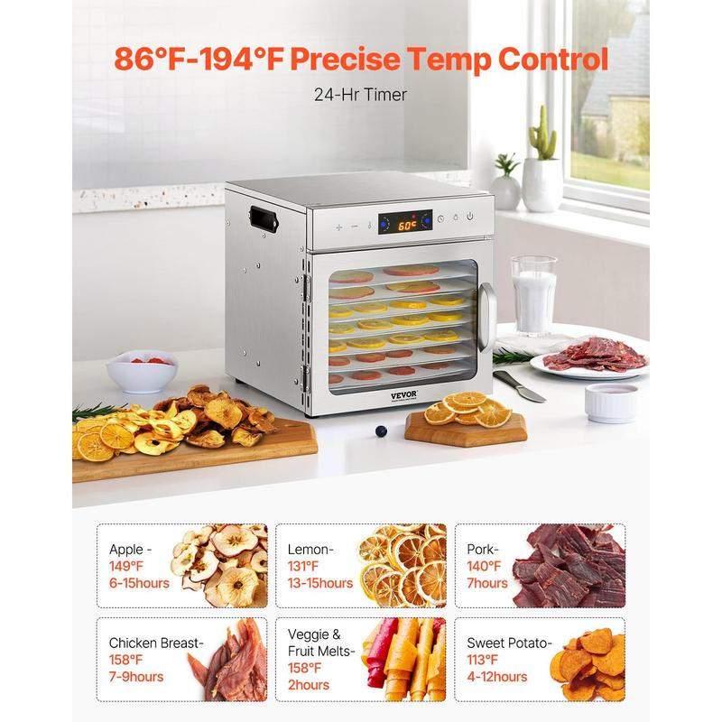 • 8-Layer Large Capacity: This large dehydrator can hold up to eight layers of food at once, drying large amounts of ingredients in one go. Control with a smart digital display, adjustable from 86℉ to 194℉ / 30℃ to 90℃, and a 24-hour intelligent timer means no need for manual supervision. Perfect for dehydrating various fruits, vegetables, jerky, herbs, teas, and seafood