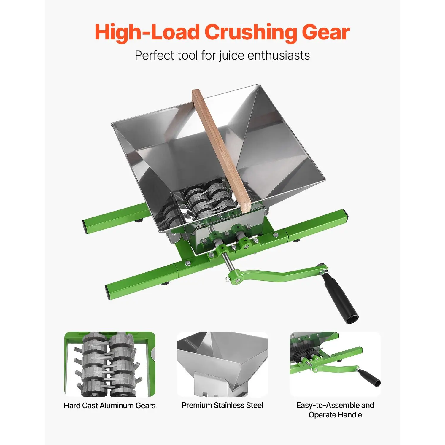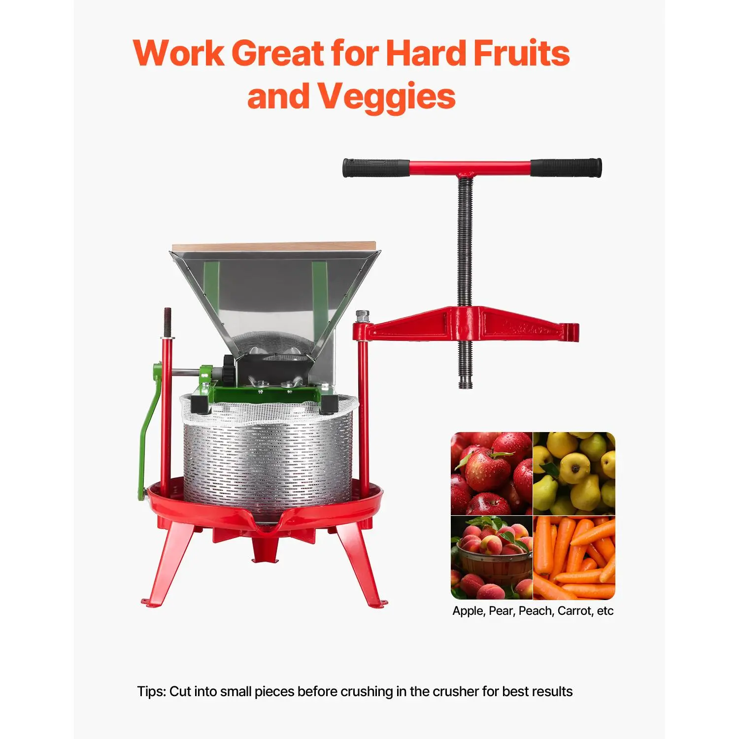 • Crush Hard Fruits & Veggies: The fruit apple wine crusher is ideal for crushing apples, pears, peaches, pineapples, carrots, and more. For larger and harder fruits or vegetables, it is recommended to cut them into smaller pieces before crushing for the best results