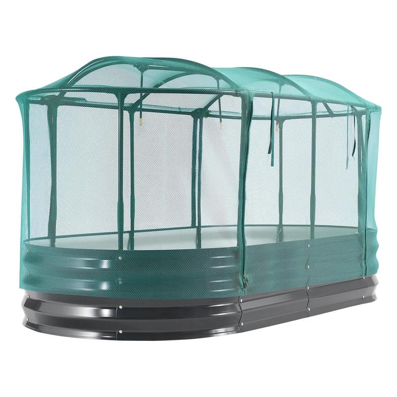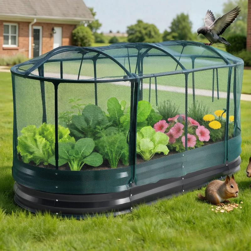 ·Ventilated Elevated Mesh Cover: The oval-frame mesh cover fully encloses the raised garden box to block birds, butterflies, and small animals, while the roll-up window allows watering, ventilation, and pruning without detaching the cover