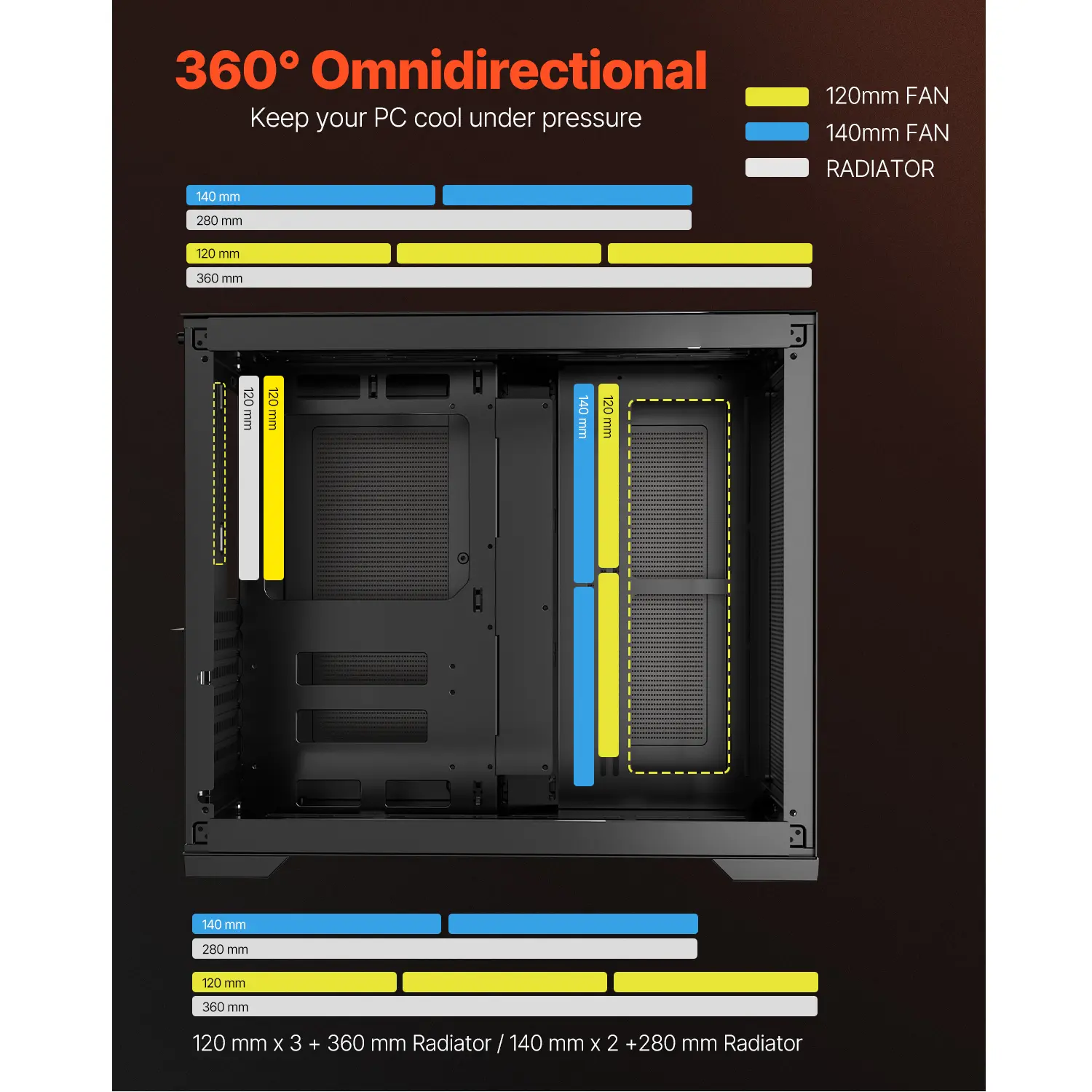 • Exceptional Cooling Solution: Supports up to 9 x 120 mm (4.72 in) fans or 6 x 140 mm (5.51 in) + 1 x 120 mm (4.72 in) fan configuration, this PC case ensures exceptional cooling efficiency. Keep your system at optimal temperatures during intense gaming sessions, avoiding overheating