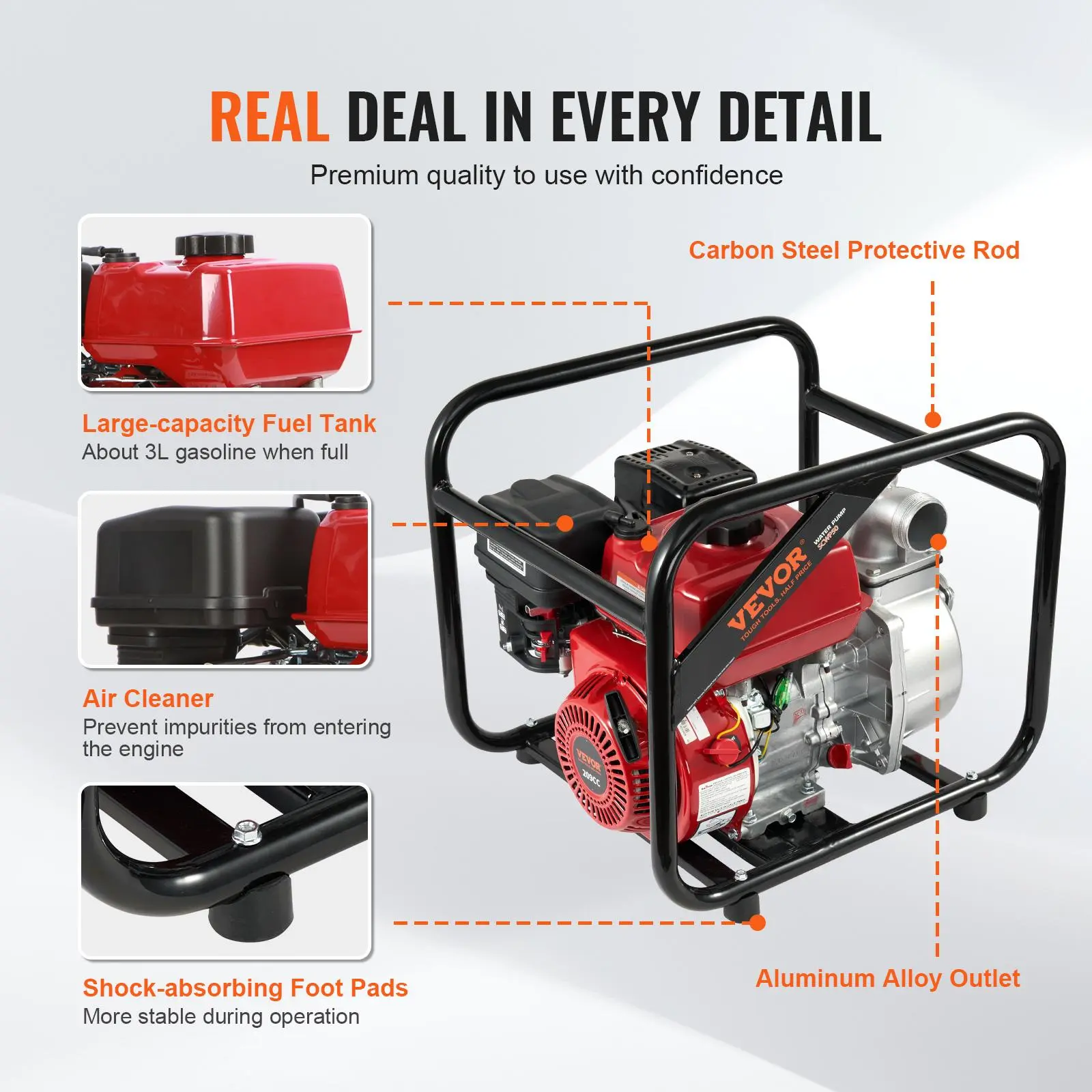 • Long-Lasting Durability: Our gas engine trash water pump is built to last with its tough aluminum alloy pump body and cast iron impeller. You can count on it even in harsh conditions. The impeller ensures great sealing performance while handling particles up to 1/3 inch in diameter, reducing the risk of clogging.