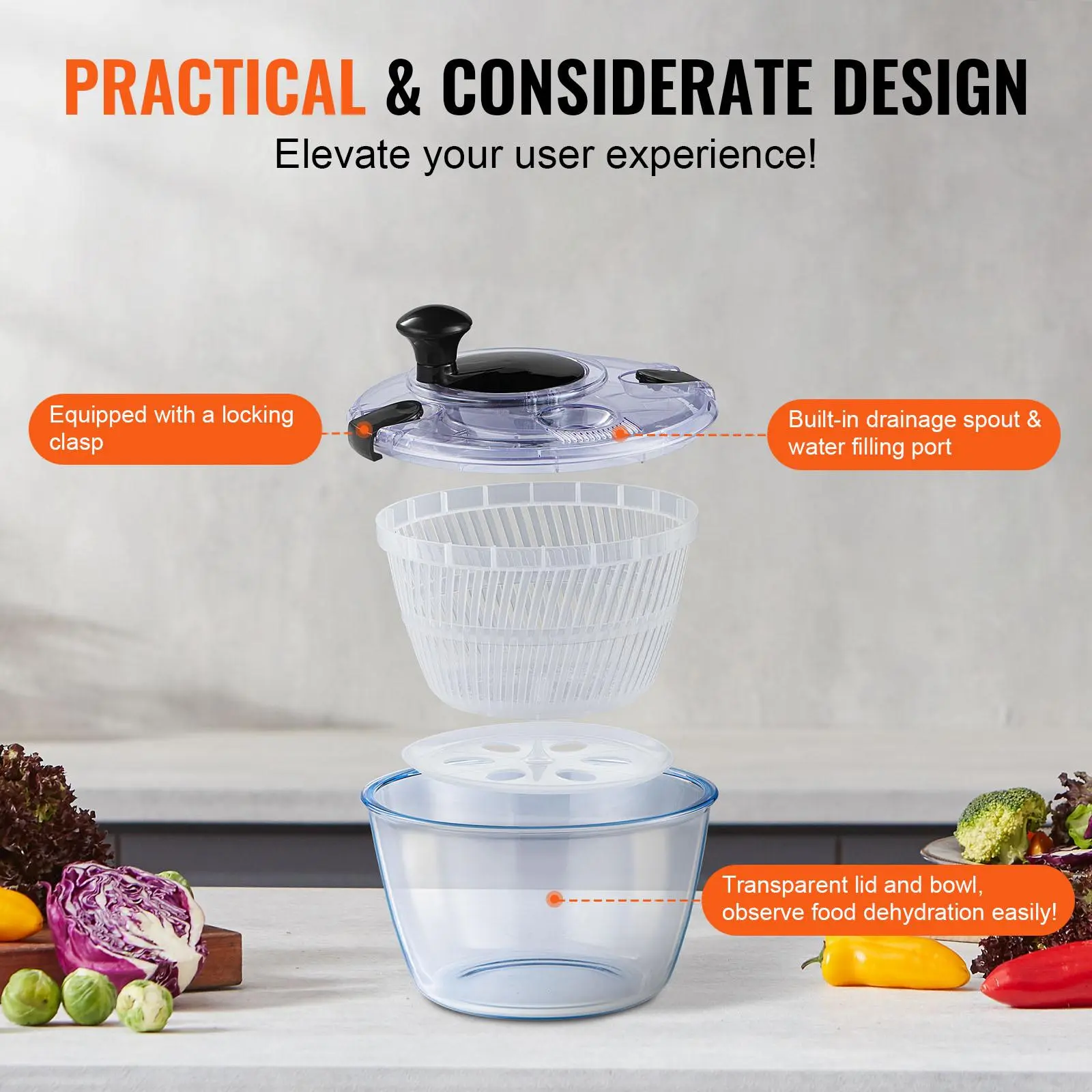 • Practical Design for Your Convenience: The glass bowl doubles as a storage or mixing bowl, and the lid comes equipped with a drainage spout and a water filling port, making it easy to pour and clean. Plus, the lid features a secure locking mechanism, ensuring stability during spinning. The clear glass bowl and lid allow you to observe the progress of your ingredients as they dry, so you can achieve the perfect salad texture every time!