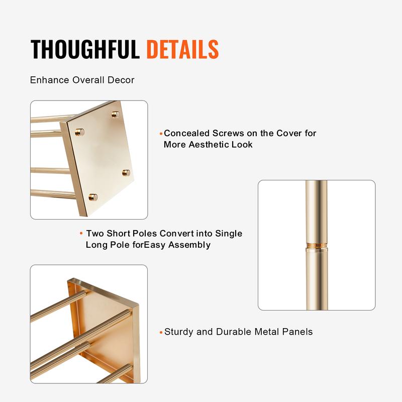 • High-Quality Materials: This wedding flower stand is crafted from high-quality iron material that is resistant to deformation and built to last. It boasts a surface finish with French gold electroplating, using a mid-to-high-level electroplating process to achieve high brightness, vibrant colors, and easy cleaning. The columns are securely fastened to the frame using screws to prevent warping, ensuring increased stability after installation.