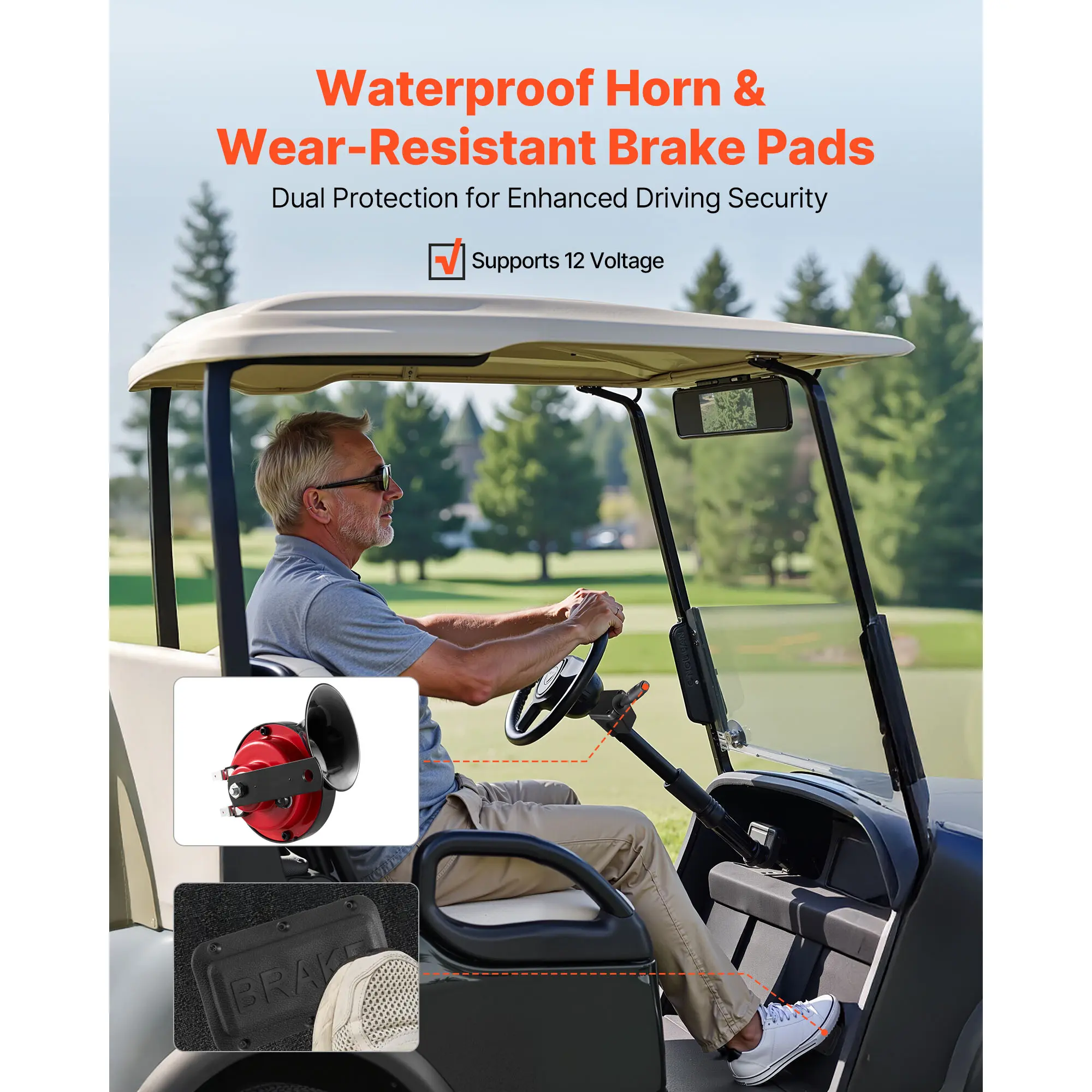 • Drive with Peace of Mind: Our golf cart light kit features a waterproof horn and durable brake pads, supporting 12 voltage. Whether it’s rainy or rough terrain, the horn stays clear, and the brakes are quick with dual protection