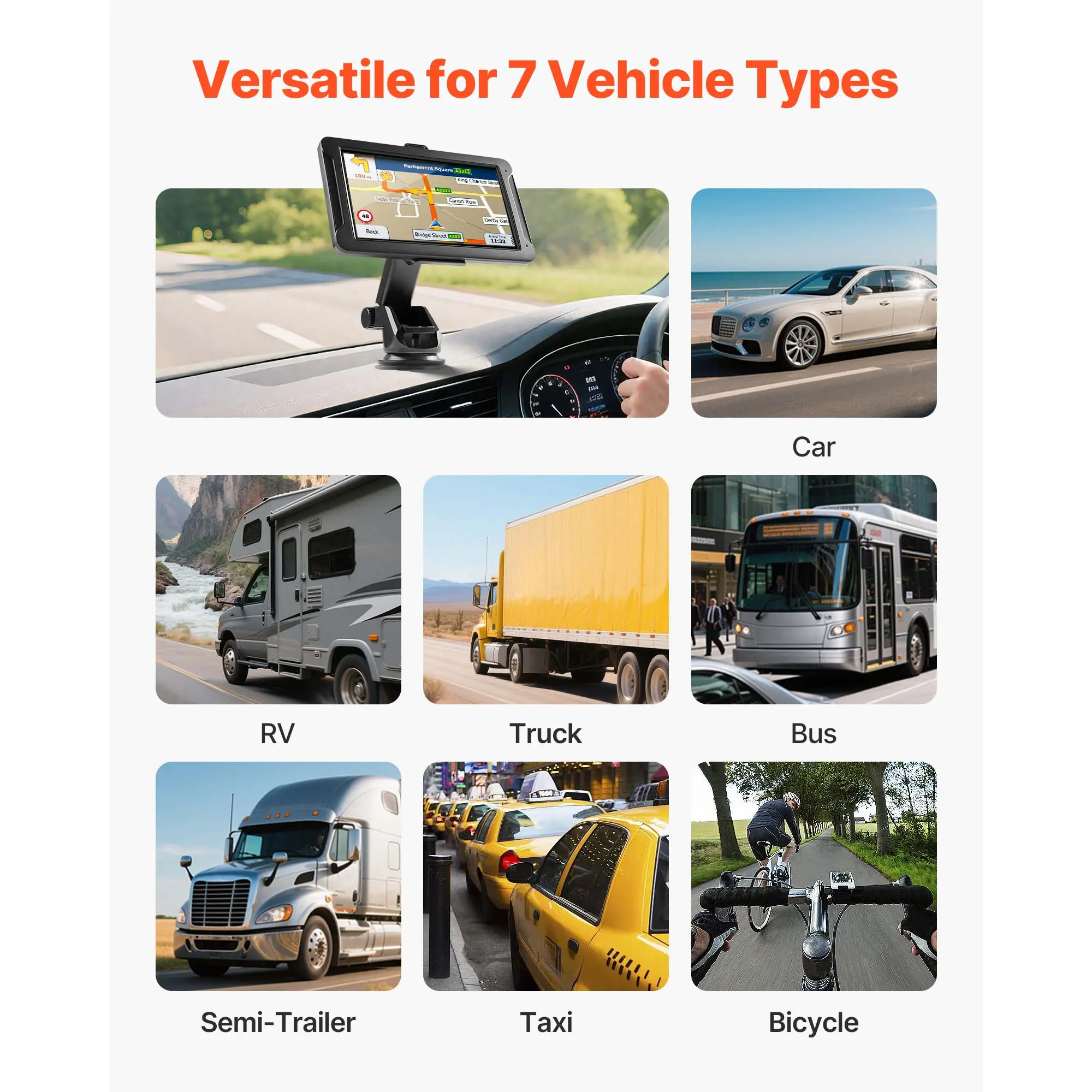 • Multiple Modes: This GPS truck navigator supports 7 modes: Car, Pedestrian, Bicycle, Emergency, Bus, Taxi, and Truck. To switch to "Truck" mode, simply go to Navigation-Settings-Route Settings-Vehicle -Truck—and you're all set to meet your needs