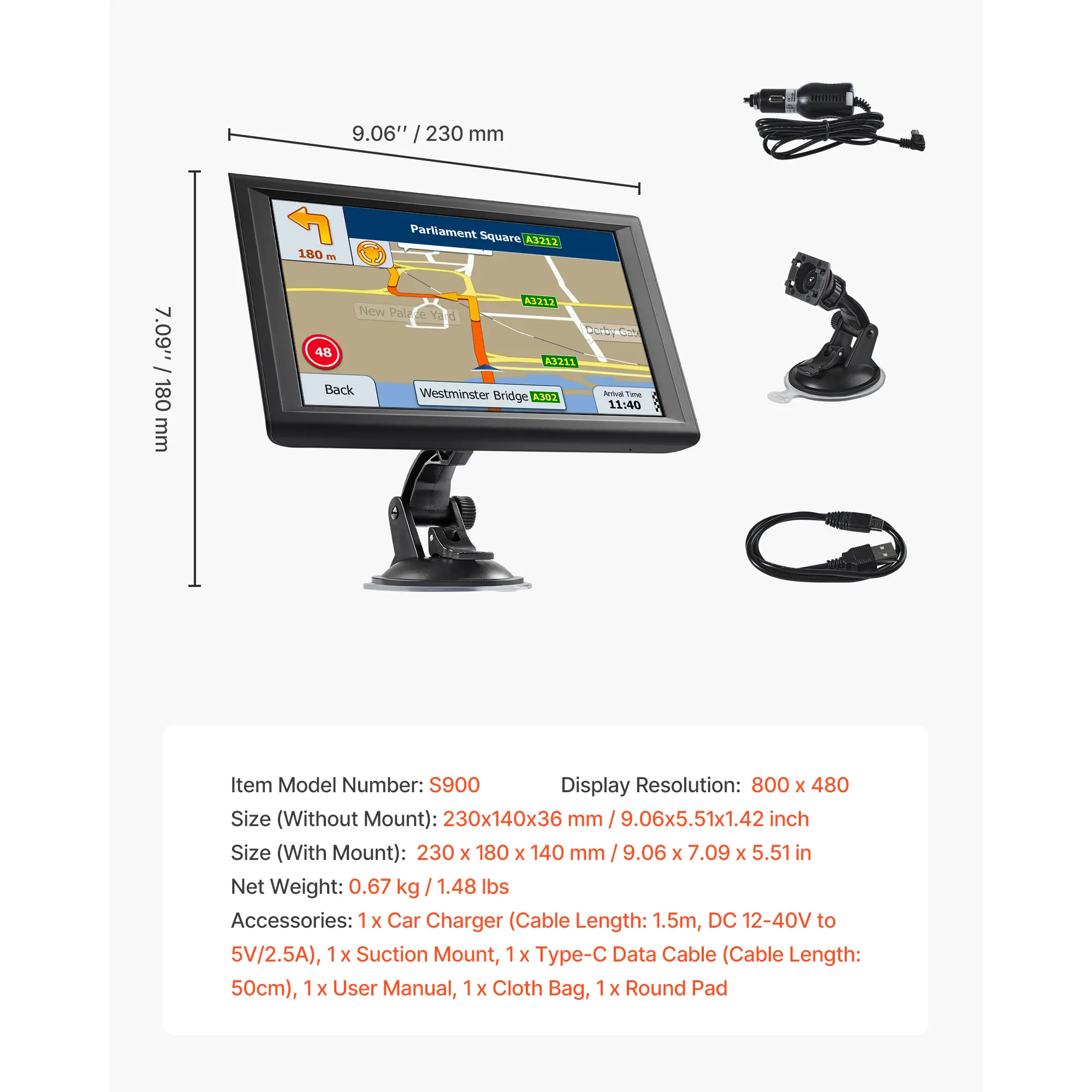 • Included Accessories: This GPS navigation for car includes: 5V/2.5A car charging cable (1.5m), suction mount, 0.5m USB cable, user manual, cloth bag