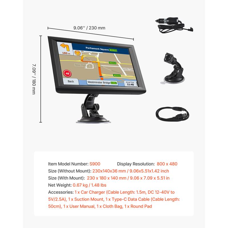 • Preloaded Maps: Our car GPS comes with 16GB storage (with 1GB RAM), TF card expandable, built-in 2500mAh battery and car charging cable. The 9" anti-glare HD screen (800x480) features responsive touch, tempered glass, and high-brightness display