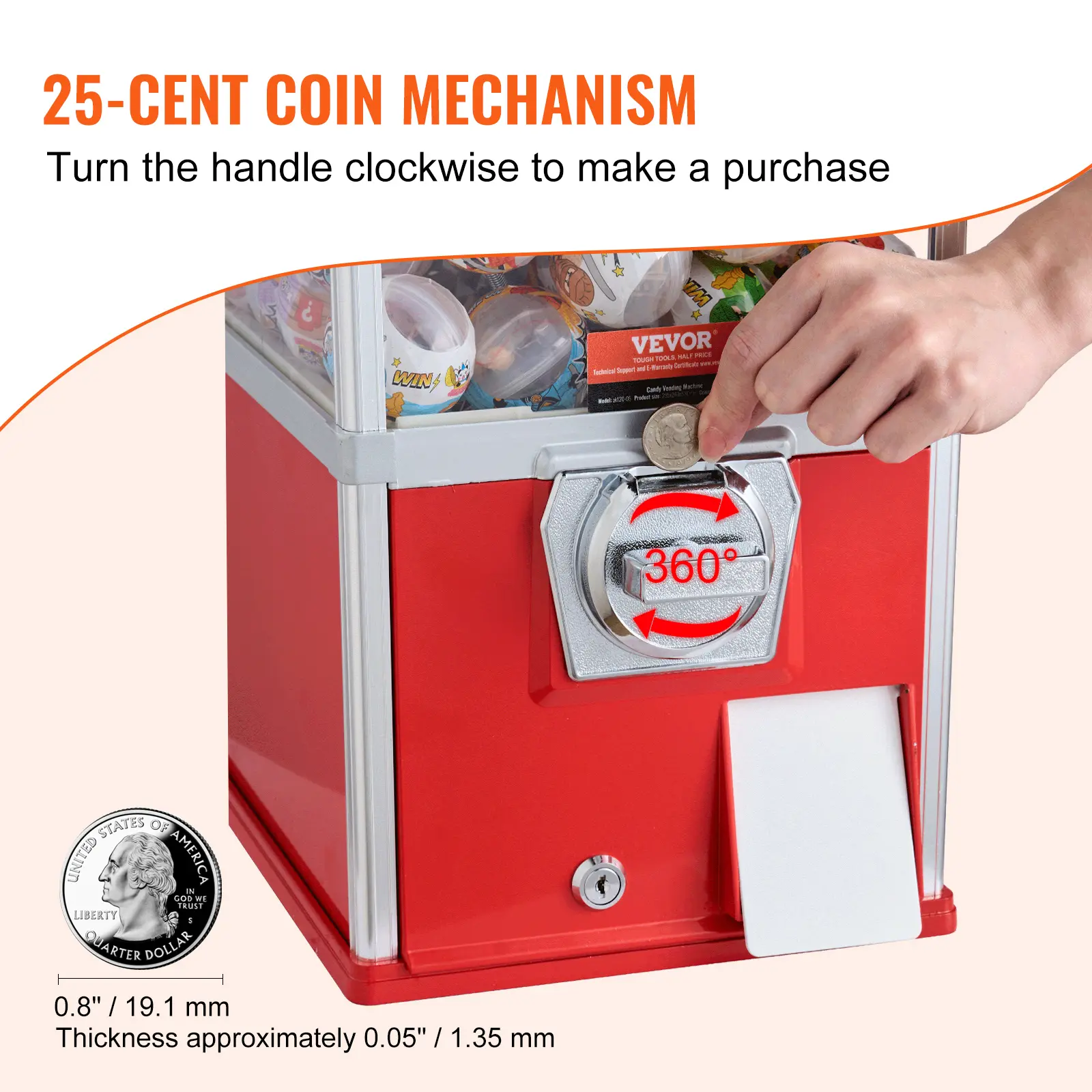 • 25 Cent Coin Operation: Utilizing a coin-operated mechanism, this capsule dispenser requires no electricity. Simply insert a 25-cent coin, rotate the control lever clockwise 360 degrees, and you'll find mini capsule toys at the exit. The process is simple, fun, and quick.