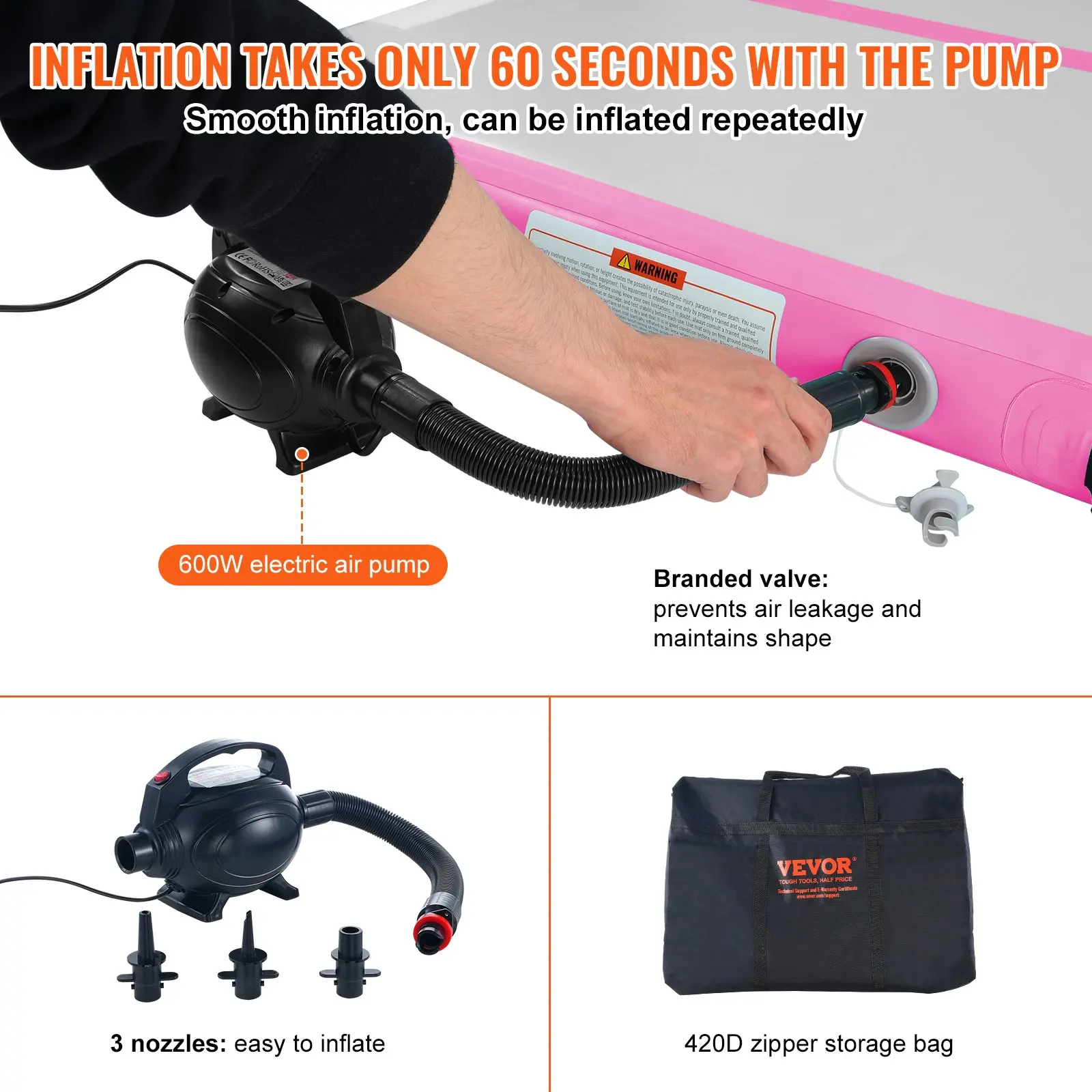 ·Easy Inflation and Deflation: This training mat is equipped with a 600W electric air pump, 3 nozzles, and a hose. The maximum pressure reaches 3.2 PSI. Inflation or deflation can be completed in just 1 minute, and the mat can maintain its pressure for several days without deflating, simplifying usage.