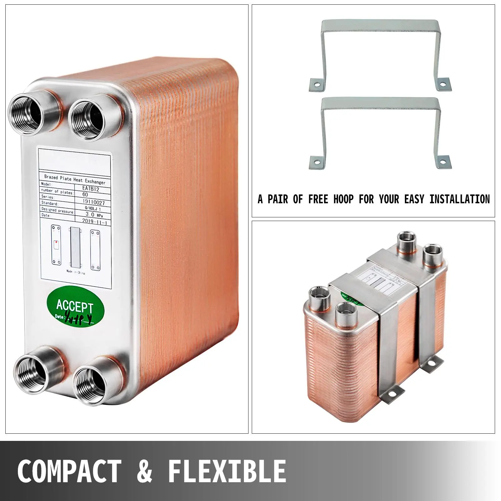 5. VEVOR Heat Exchanger 3\"x7.5\" 60 Plates Brazed Plate Heat Exchanger 316L 1/2\" BSP FPT Heat Exchanger EATB12 Beer Wort Chiller for Hydronic Heating