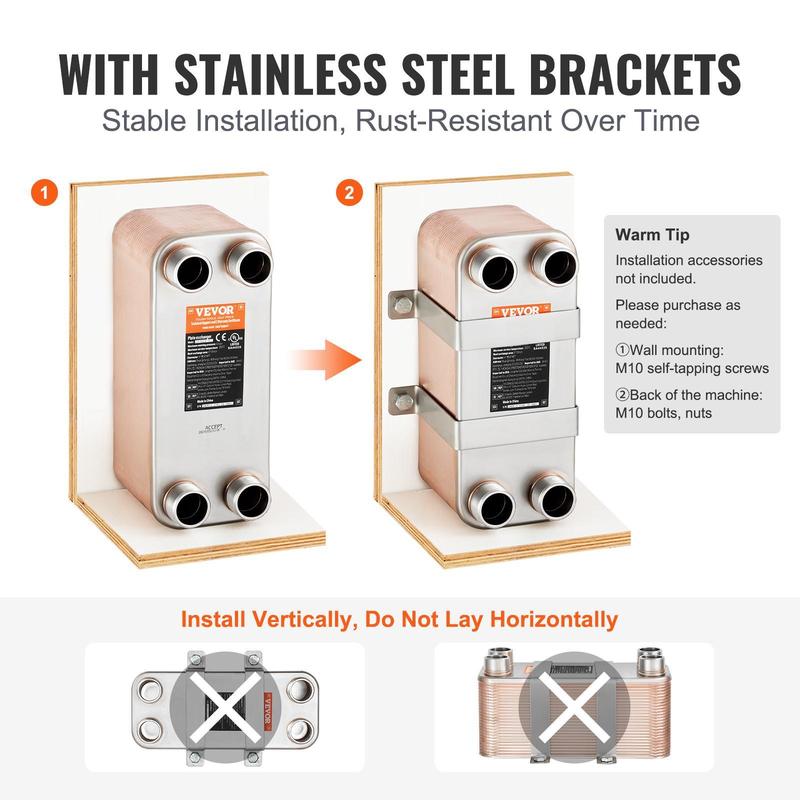 • Stable Installation: Includes two stainless steel brackets made of 304 stainless steel, offering excellent rust resistance and stability for easy and secure mounting of the heat exchanger.