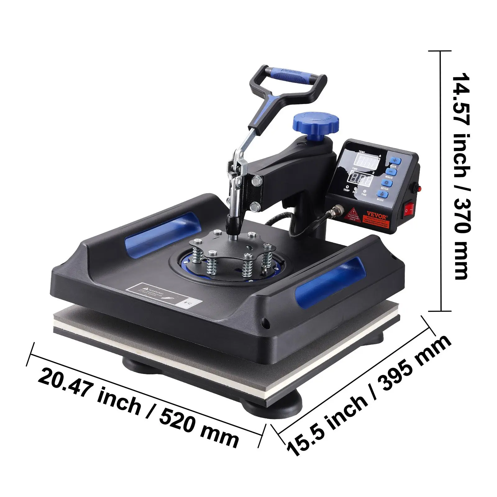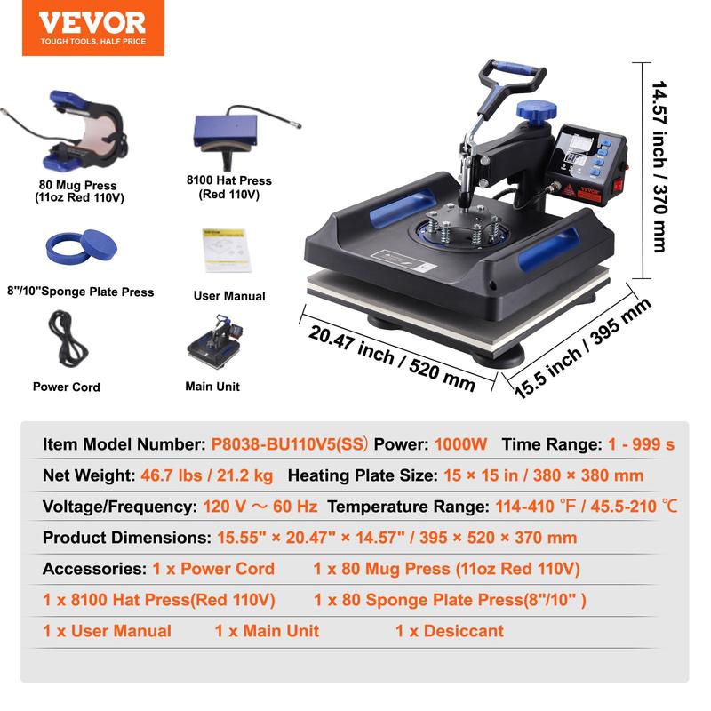 • 【5-IN-1 VERSATILE KIT】- With a 15"x 15" (38 x 38 cm) large heat platen, the 5 in 1 heat press uses Teflon-coated platen, non-stick & stable. Suitable for applying letters, numbers, and patterns onto caps, T-shirts, mugs, plates, etc.