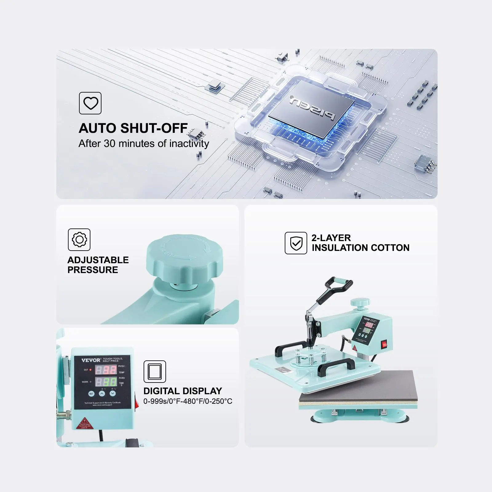 • Precise Digital Control: You can preset the temperature and time according to different transfer materials to achieve satisfactory results. Temperature range: 32-480℉ / 0-250℃, time range: 0-999s. You can switch between °C and °F with the (▲/▼) buttons to select your desired temperature display mode. When the preset temperature is reached, the heat transfer machine will automatically stop and sound an alarm, preventing over-heating.