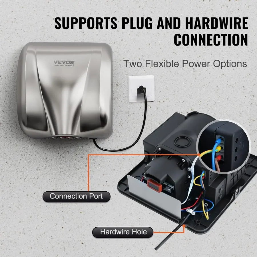 VEVOR Heavy Duty Commercial Hand Dryer, 1300W Automatic High Speed Stainless Steel Warm Wind Hand Blower, 120V Plug in/Hardwired Two Power Options, Compliant for Industry Business RestroomsVEVOR Heavy Duty Commercial Hand Dryer, 1300W Automatic High Speed Stainless Steel Warm Wind Hand Blower, 120V Plug in/Hardwired Two Power Options, Compliant for Industry Business Restrooms