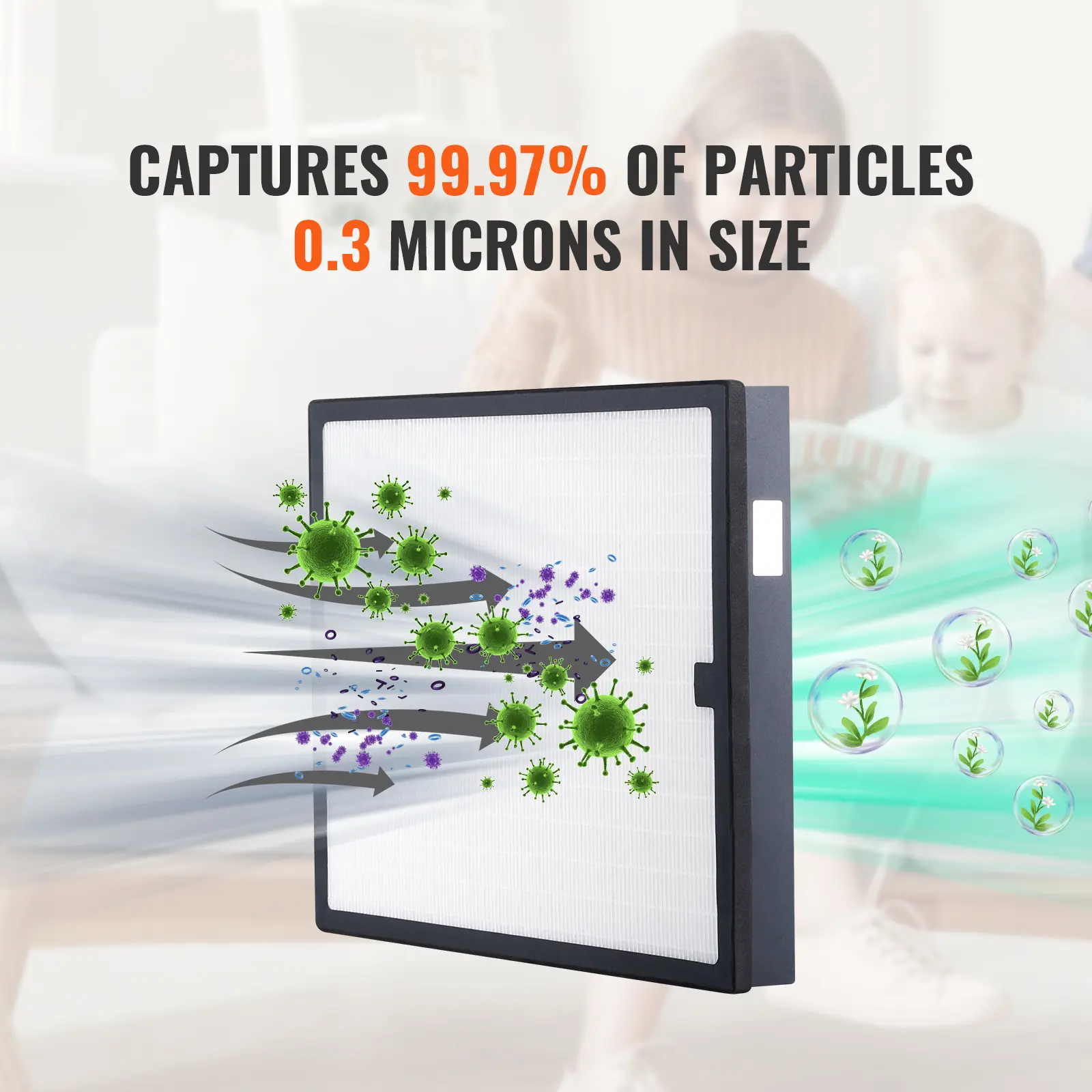 • High Efficient Filtration: The HEPA filter can effectively capture airborne particles as small as 0.3 microns with a high efficiency of 99.97%, including allergen, pathogens, etc..