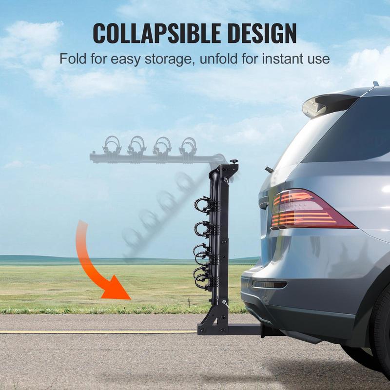 • Tilting & Folding Design: Need access to your trunk? No problem! Our hitch bike rack features a safety pin for easy backward tilting, allowing you to open your trunk without removing the bike carrier. Plus, the folding design makes it a breeze to store in your vehicle's rear, trunk, or garage without taking up precious space.