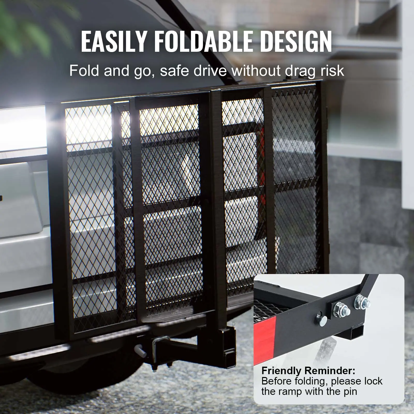 • Fold and Go, No Hassle: Our mobility scooter basket rack features a user-friendly foldable design. No more hassle of disassembling after use! Easily fold the ramp and stand upright the basket, you can hit the road again with convenience and security. (Friendly Reminder: Before folding, please lock the ramp with the pin)
