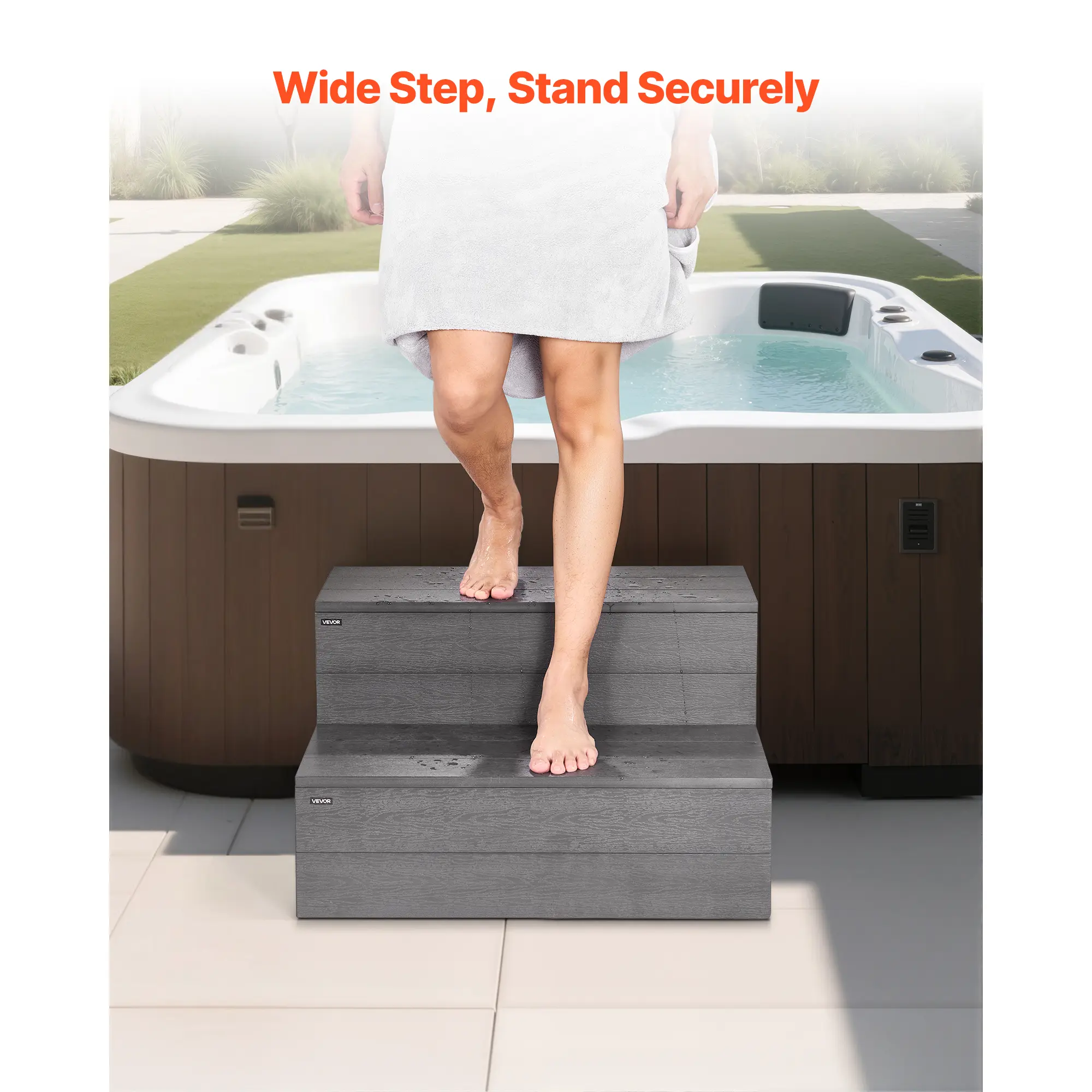 • Quick-Drain Treads: The spa step features enlarged treads channel water away to reduce pooling; barefoot-friendly for secure, comfortable climbs on your hot tub stairs. Make every climb smoother and more secure