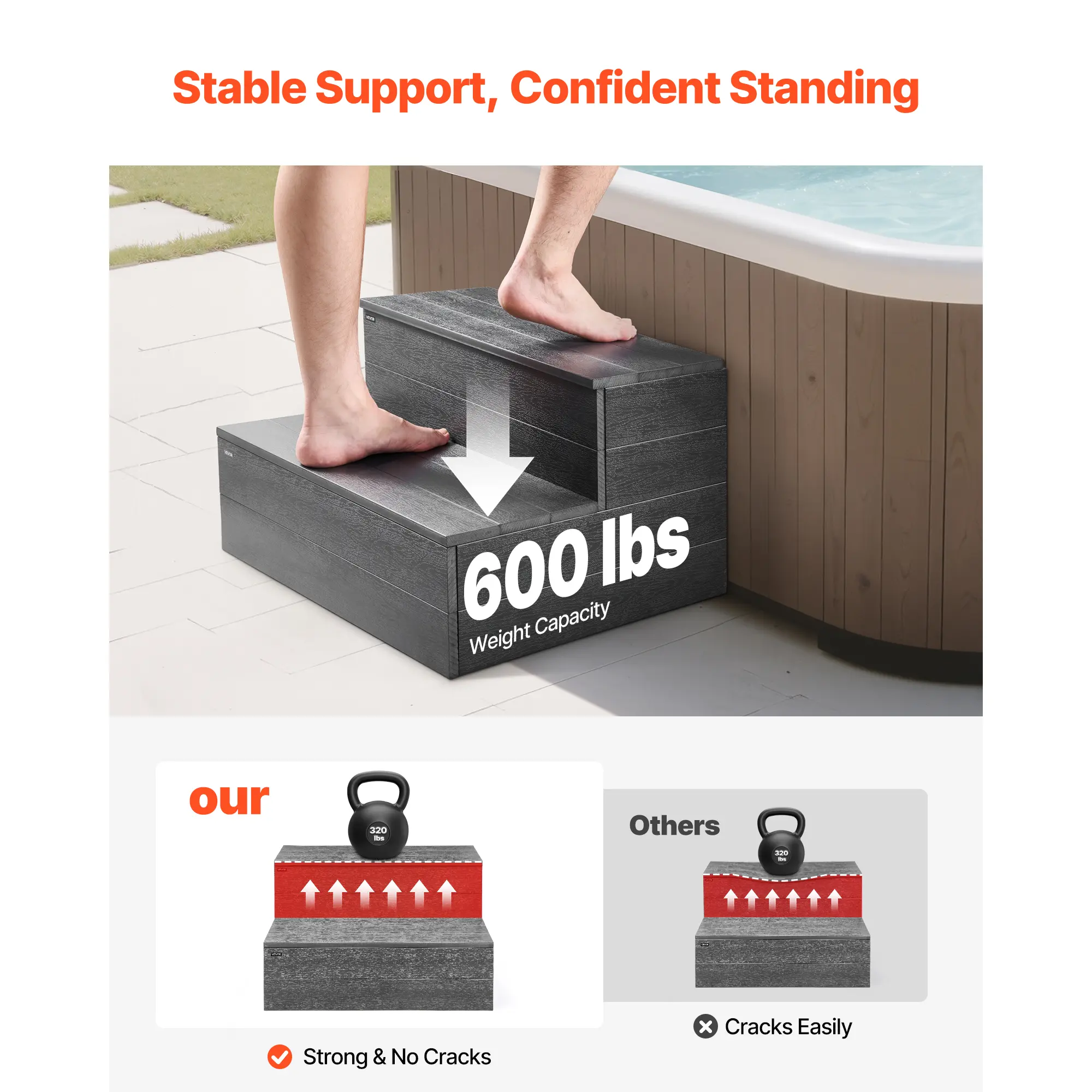 • 600 lbs Powerful Load Bearing: This hot tub step delivers rock-solid stability up to 600 lbs, resisting flex and fracture, so you can stand with confidence. Step in with confidence today