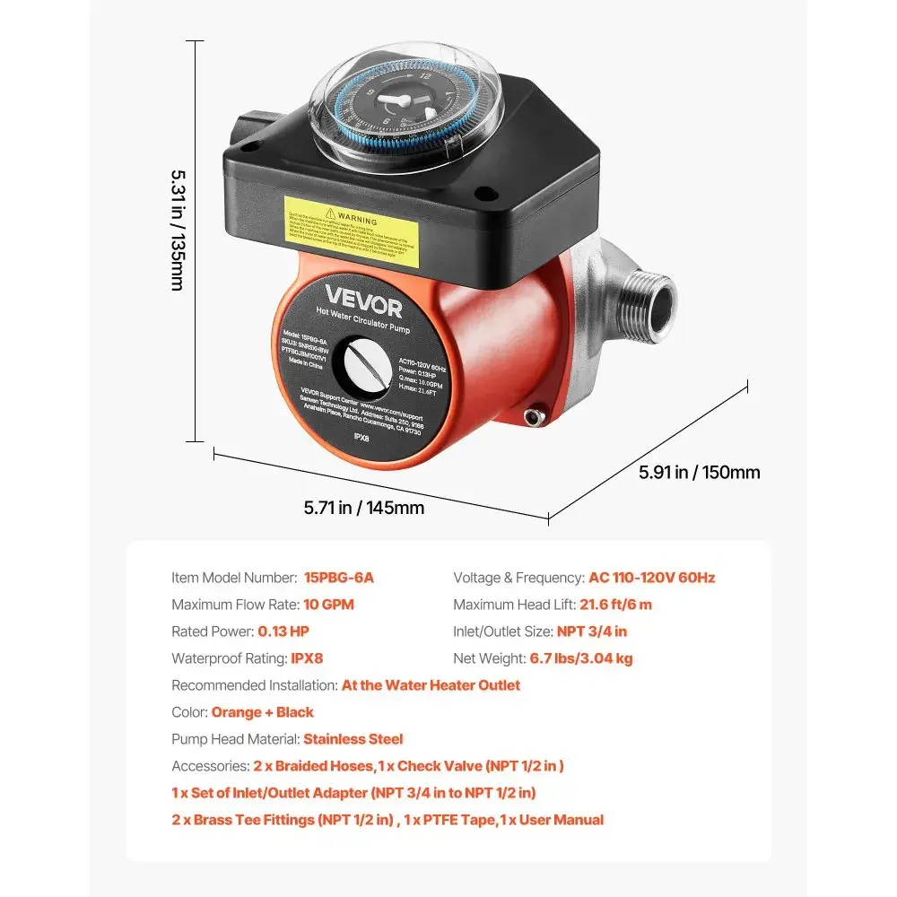 ·Customizable Schedule: The built-in mechanical timer allows you to program when the hot water circulation pump runs. Customize your hot water supply to match your household’s daily schedule, ensuring comfort while saving energy.