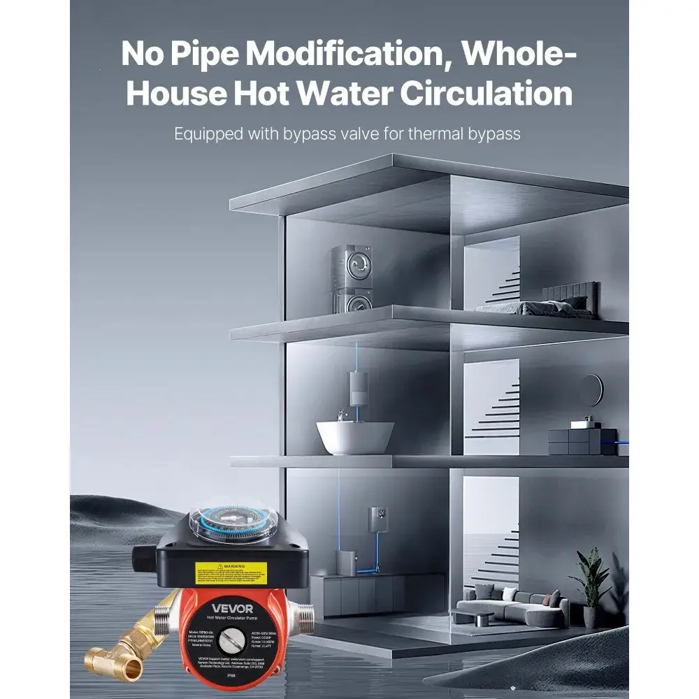 ·Max Flow Rate: This recirculating pump delivers a max flow rate of 10 GPM and 21.6 ft head lift. It ensures quick hot water circulation. The built-in bypass valve keeps water moving efficiently and auto shuts off once the right temperature is reached.