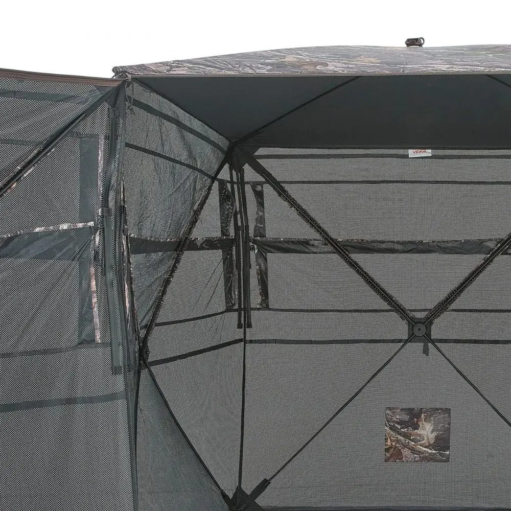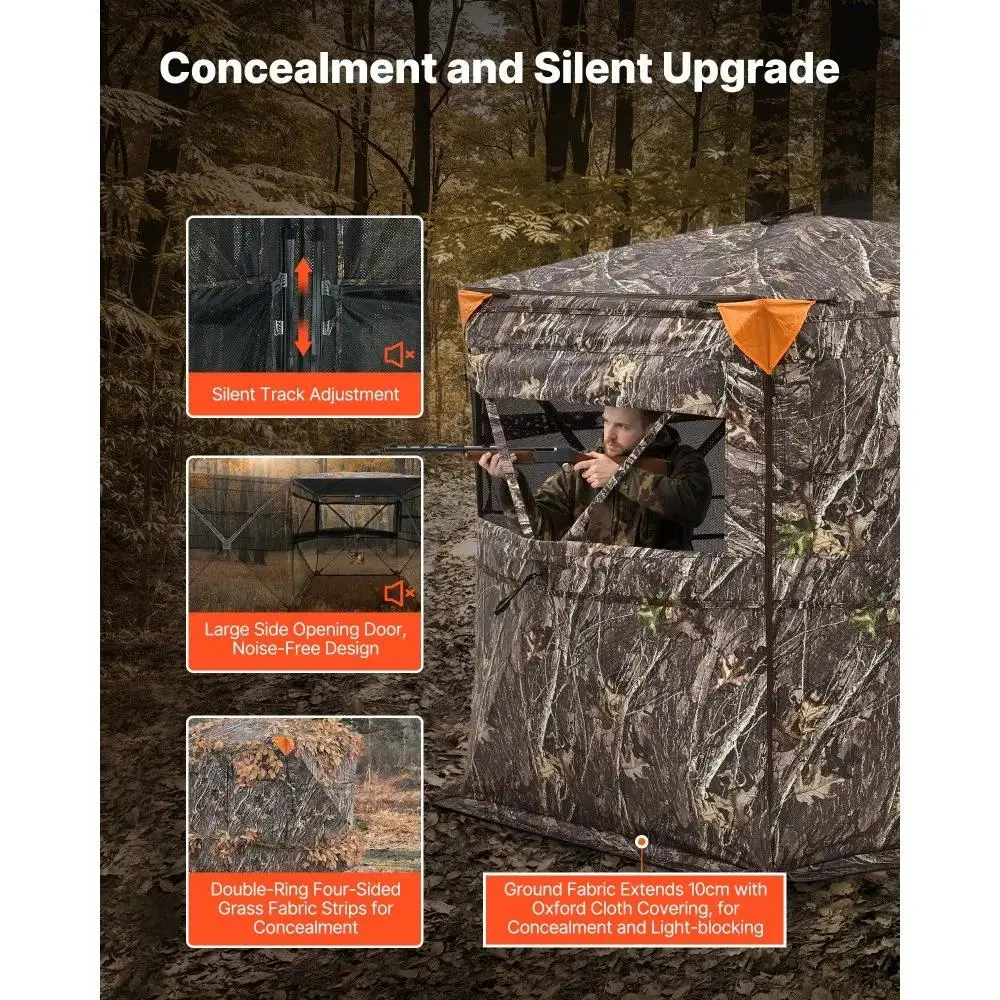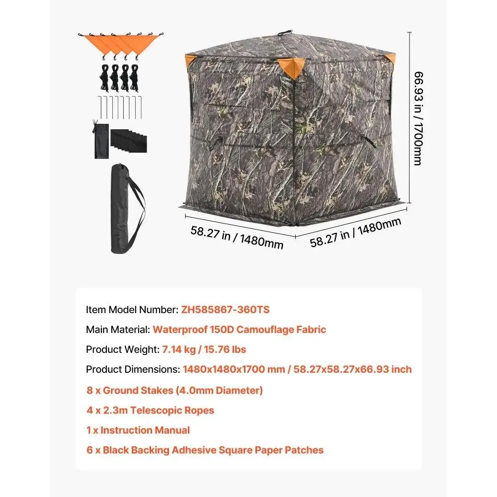 The VEVOR Hunting Blind is a 360-degree portable camouflage tent, ideal for turkey and deer hunting. It accommodates 2-3 people with a see-through ground blind design. The durable construction ensures a concealed shelter, perfect for outdoor enthusiasts. This blind offers a discreet hunting experience with a silent side door and window.