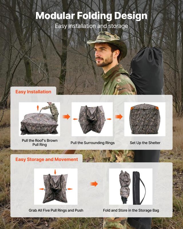 With a telescopic folding design, the portable hunting blind fits in a dual-shoulder storage bag. Just pull the center point of each side, secure with wind ropes and stakes to complete installation. The blind is easy to carry and assemble, making it convenient for hunting.
