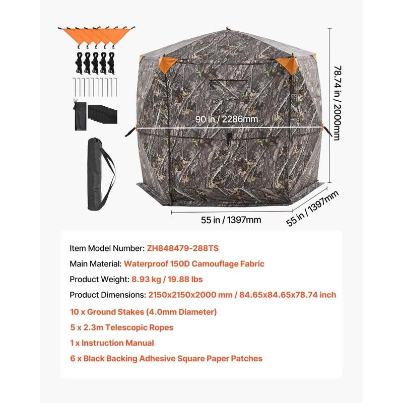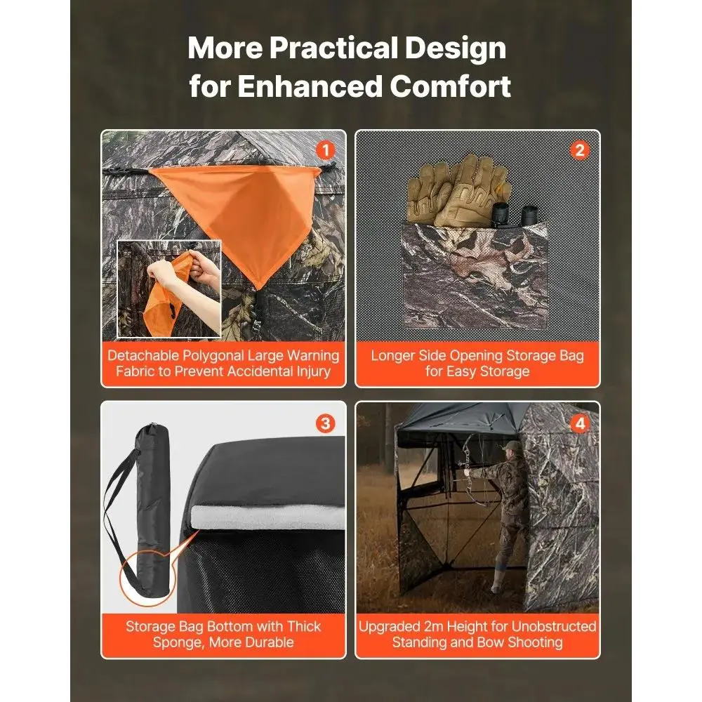 The VEVOR Hunting Blind is designed for 6-7 person use. It offers a 288-degree view with 5 sides, ensuring comprehensive visibility. This portable camouflage tent is perfect for turkey and deer hunting. It includes a carrying bag for easy transport. The blind features a silent zipper door and window, enhancing user comfort. Ideal for concealed shelter, it provides a discreet hunting experience.