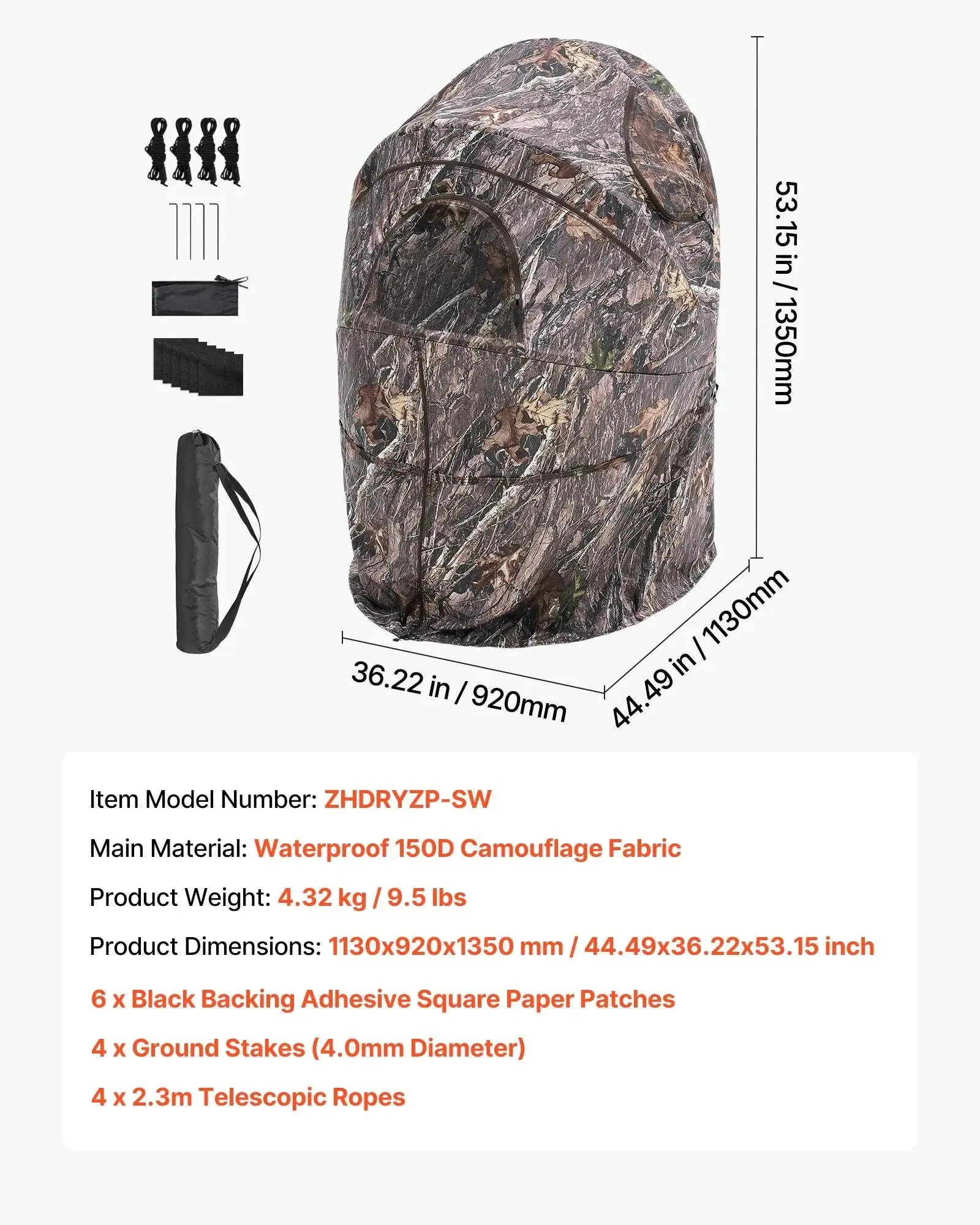 The upgraded all-aluminum hub ensures a sturdy structure. The hunting ground blind is made of 150D waterproof fabric, resistant to rain and wind. The solid fiberglass tubes are detachable, and reflective fabric can be attached for added visibility.