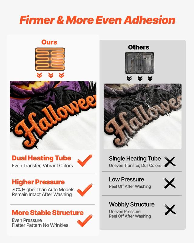 The 15 x 15 in heat press features 70% higher pressure than automatic models, surpassing even traditional ones. Its new high-stability design ensures even pressure distribution for superior results and clearer long-lasting patterns.