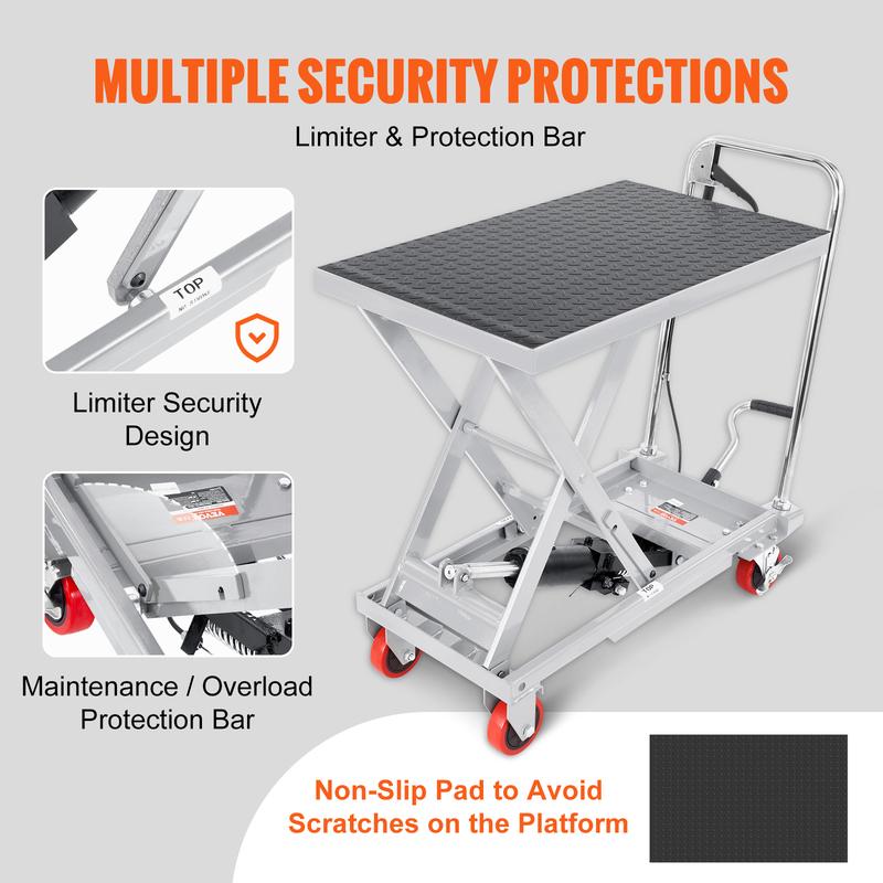 • Secure Design: Our hydraulic table cart incorporates thoughtful security features, including limiter protection to prevent over-lifting. It also features a maintenance/overload protection bar for easy maintenance. For added stability during transport, we provide a rubber non-slip pad that prevents movement and enhances overall stability.