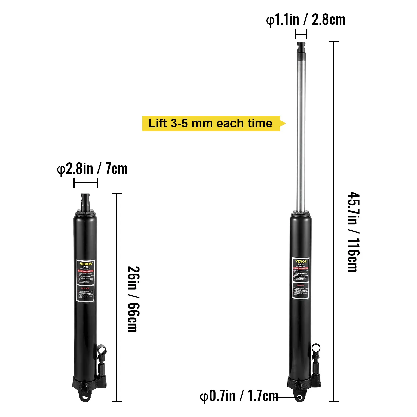 • 26" -45.7" Lifting Range: Minimum height: 26 in/66 cm. Maximum height: 45.7 in/116 cm. The long ram hydraulic round bottom jack provides an ample 19.7 in/50 cm stroke for the optimal lift of objects up to 3 ton/6600 lb. in weight. And the slow release function for reliability and security.