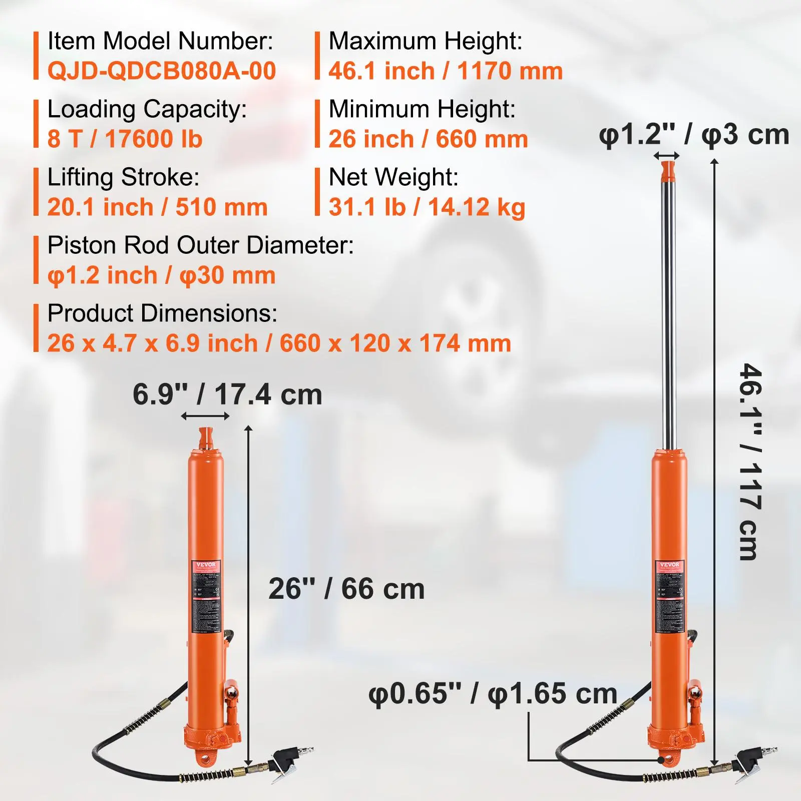 • 8-Ton Load Capacity & Large Height Range: With a robust 8-ton load capacity and a large height range from 26" to 46.1" (660-1170 mm), this hydraulic long ram jack effortlessly lifts heavy loads. And its slow-release function allows you to control your lifting tasks safely.