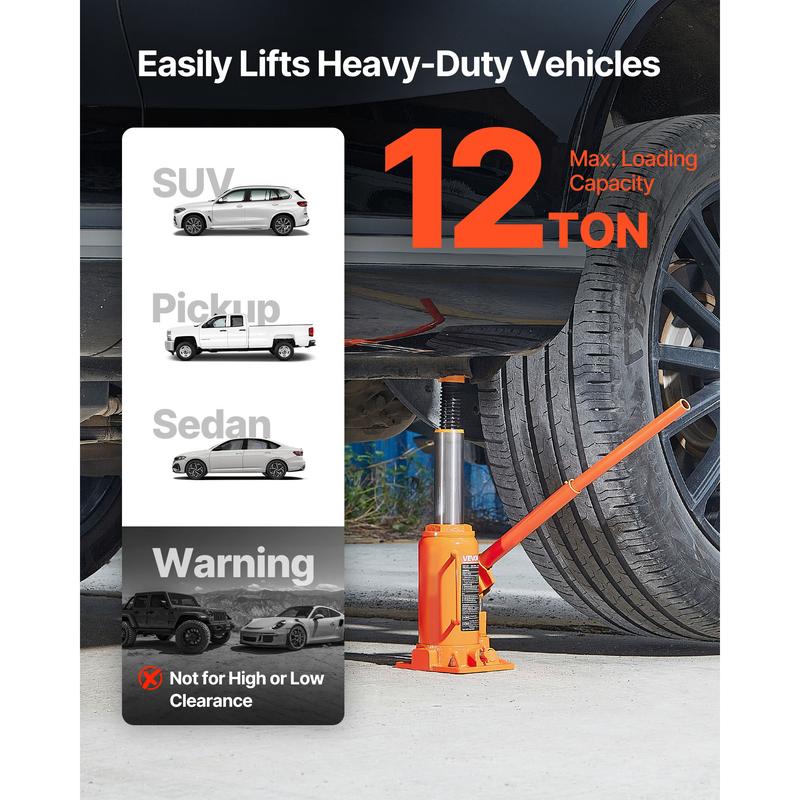Our hydraulic bottle jack handles up to 12 tons (26,455.5 lbs). Perfect for sedans, pickups, SUVs, and small towable RVs. Ideal for tire changes, quick inspections, and lifting farm equipment. This jack ensures reliability and safety in various applications.