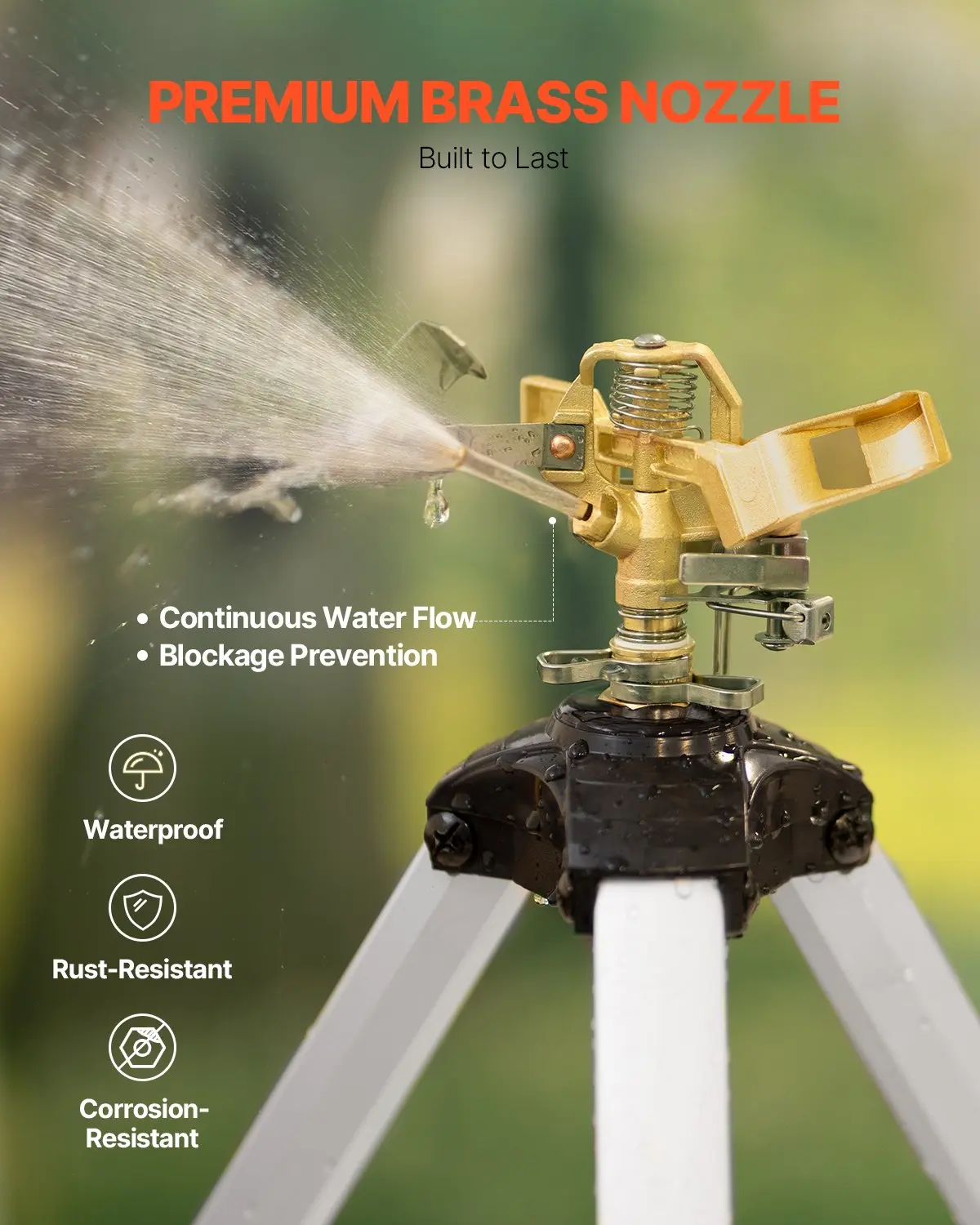 ·High-Quality Materials: Made of heavy-duty brass, the garden sprinkler is sturdy, waterproof, rust-resistant, and corrosion-resistant for long-term use. The tripod is made of aluminum and plastic, ensuring durability. Its structure remains stable even under high water pressure.