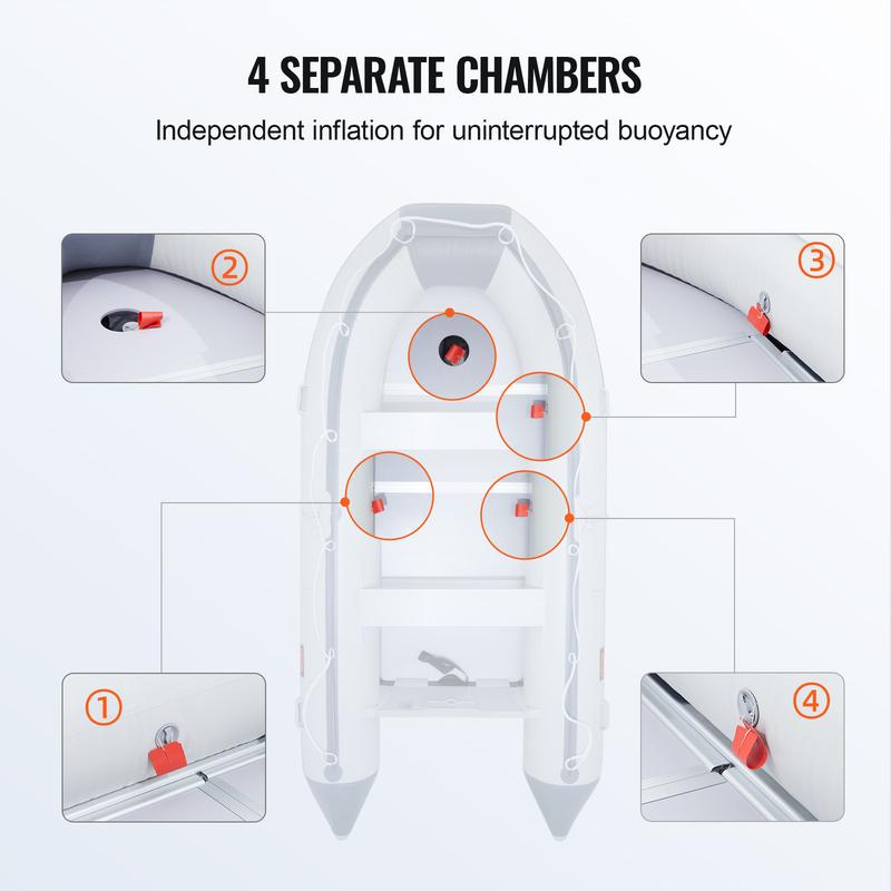 • Robust Construction: Constructed with thick PVC for superior tensile strength and puncture resistance, this inflatable dinghy boat is sea-ready and equipped to handle waves, sand impact, and seawater erosion. The upgraded design includes 4 independent air chambers for added safety, ensuring that damage to one doesn't compromise the boat's buoyancy.