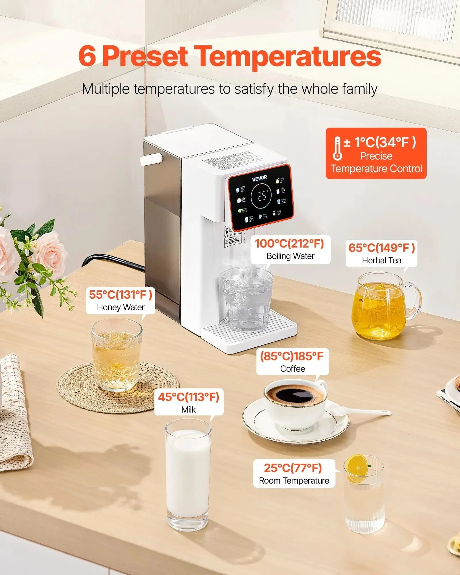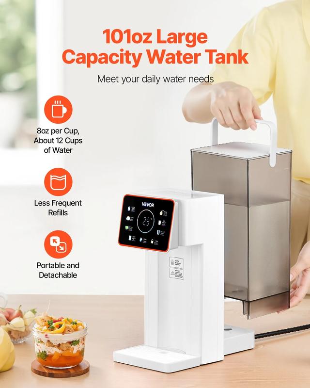 Elevate your home with the VEVOR Instant Hot Water Dispenser. This countertop model features an adjustable 6 temperatures and 7 water volumes, ensuring versatility for all needs. The 101oz removable water tank offers ample storage. Quick heating technology ensures you're never without hot water. A touchscreen interface adds convenience, while a child lock provides safety.