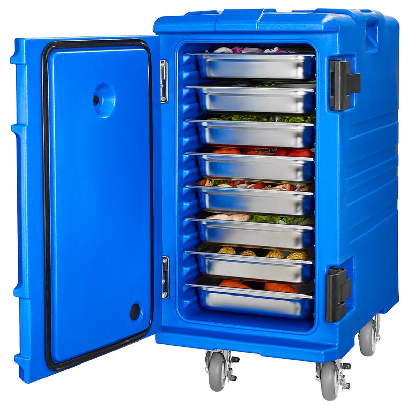 The hot box for catering has a spacious interior, measuring 21.65"x13"x25.2" (55x33x64 cm). It holds up to 127 quarts (120 L) and eight 2.5" (6.5 cm) pans. Food pans are not included. This carrier meets menu demands, transporting large amounts of food efficiently.