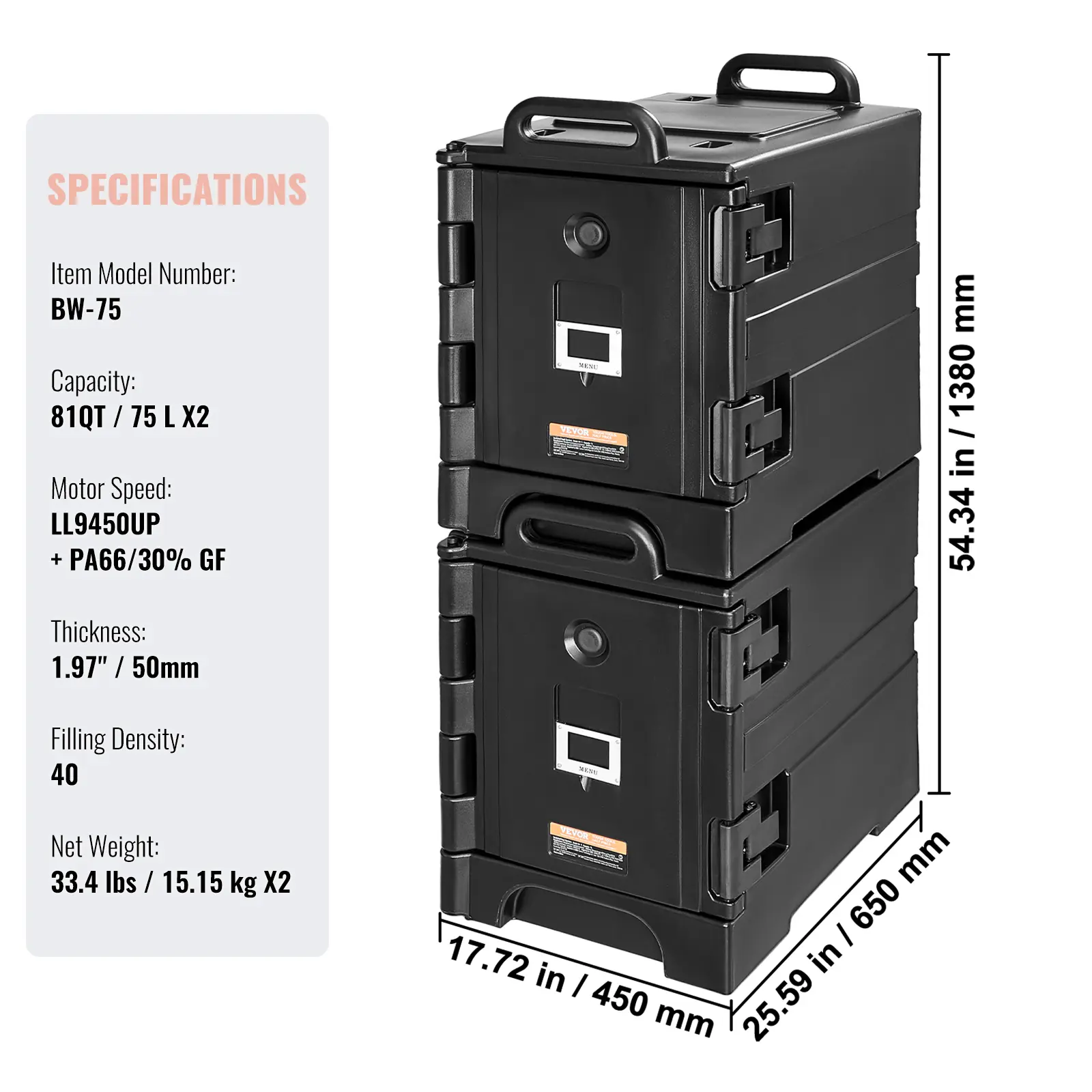 • Large Capacity Storage: With a capacity of 81QT/75L (wet volume), the hot box can hold 5 2.5" pans, 3 4" pans, or 2 6" pans, allowing ample food storage (Note: Pans Not Included).