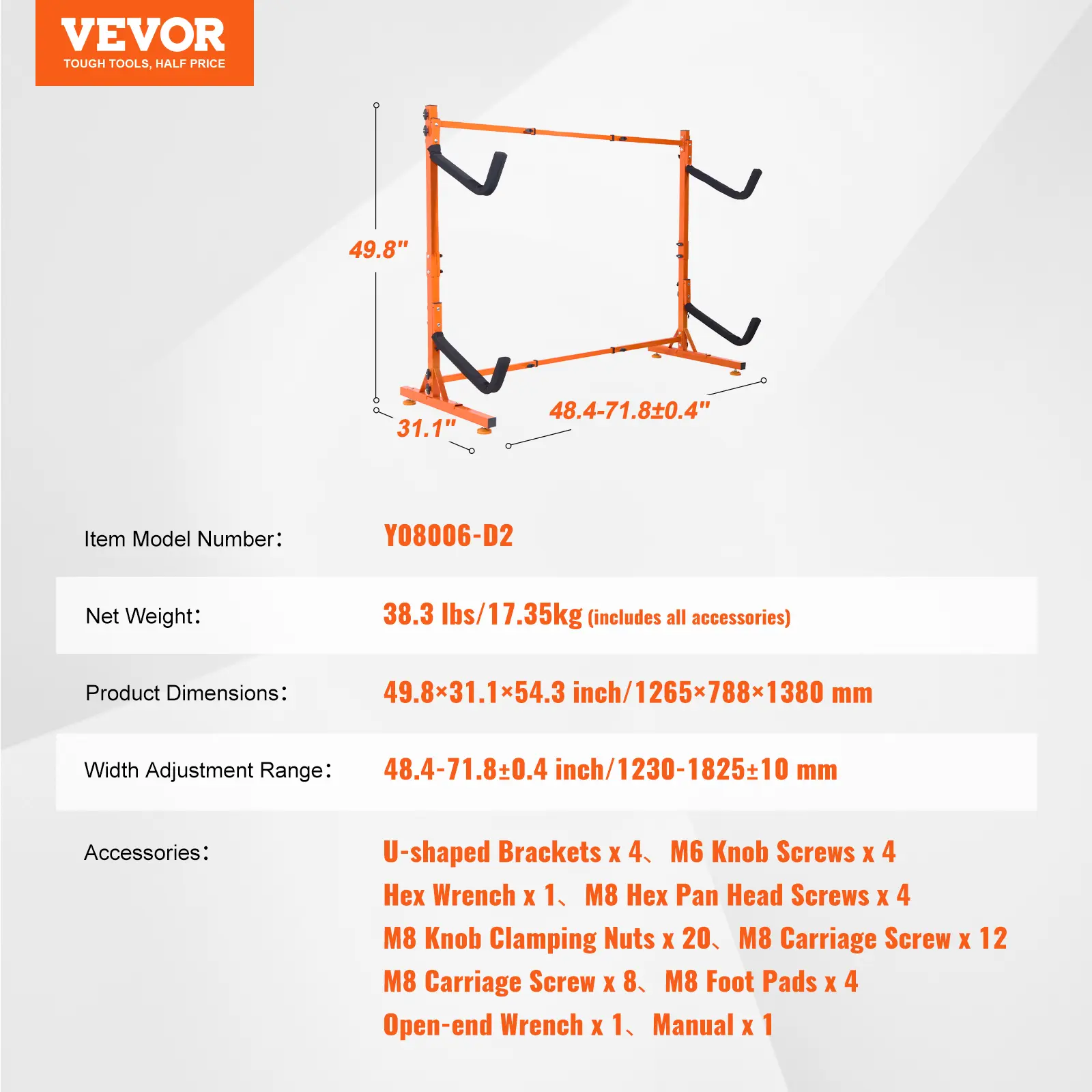 • Tool-Free Width Adjustment: Easily adjust the outdoor storage stand's width from 48.4 to 71.8 inch (1230-1825 mm) to accommodate various kayak sizes. With a 2.0-inch (50 mm) adjustment increment, you can quickly modify the width using hand screws included in the accessories. Ideal for storing long double kayaks or other large equipment.