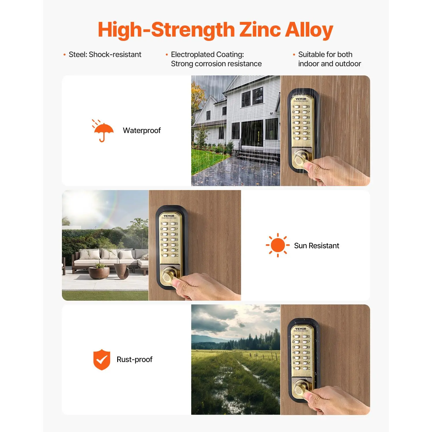 • Durable Zinc Alloy Material: The latch bolt is made from zinc alloy; this keyless mechanical combination door lock features a corrosion-resistant electroplated coating for enhanced water and rust resistance. It stands up to all weather conditions—cold winters, hot summers, and rainy days—ensuring your home stays secure with a long-lasting performance