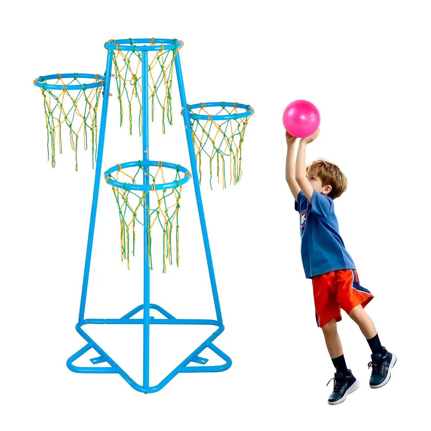 • 4 Adjustable Hoop Heights: The kids basketball hoop features 4 adjustable hoop heights: 37.8 inches, 42.9 inches, 48.8 inches, and 55.5 inches, making it suitable for children of different ages. Multiple hoops also add extra fun and interaction to the game, which is great for starting a group basketball competition!