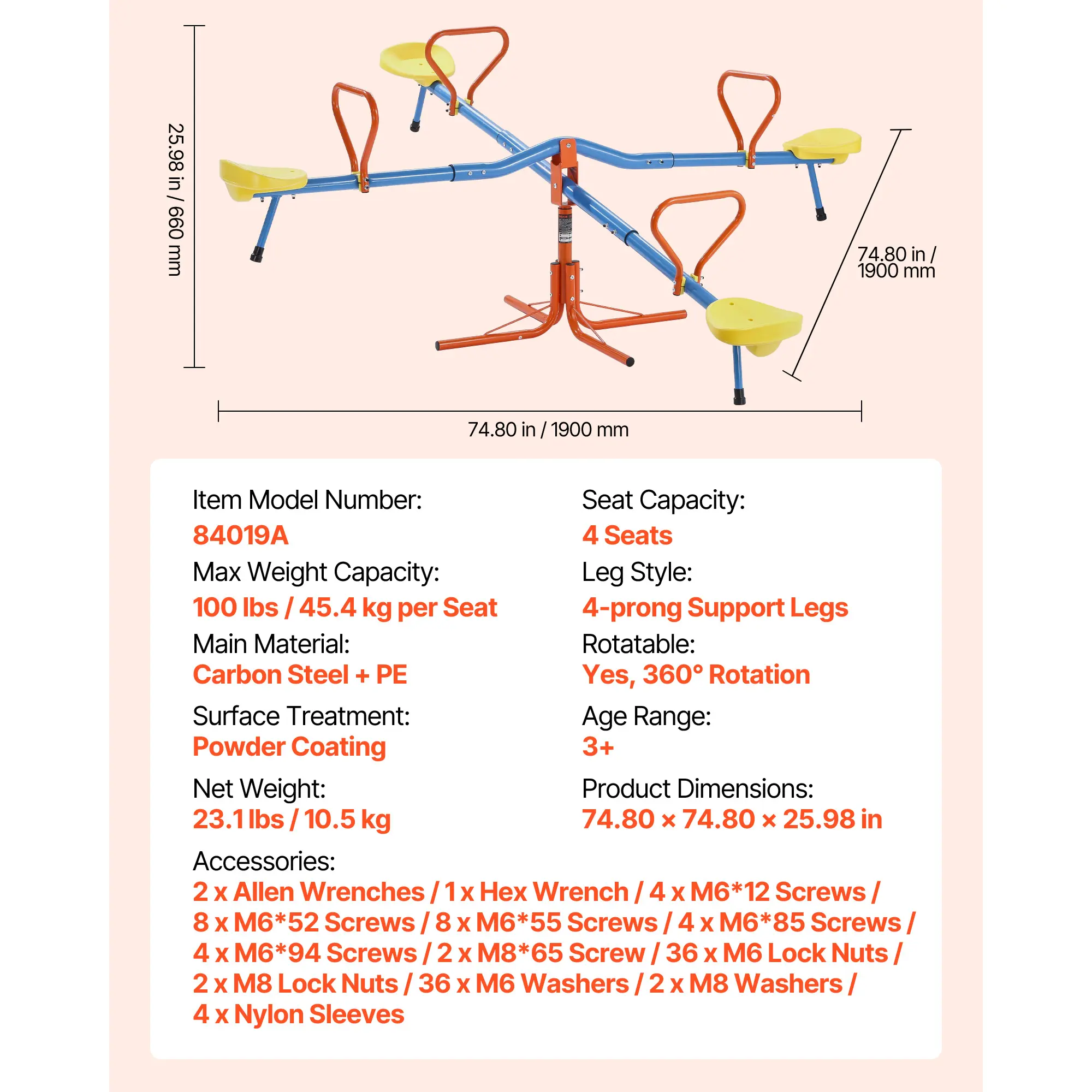 • Durable & Weather-resistant: Made from carbon steel with a powder coating, this kids teeter-totter supports up to 110 lbs / 49.9 kg per seat. It's waterproof and rust-resistant, ensuring durability for years of play, rain or shine