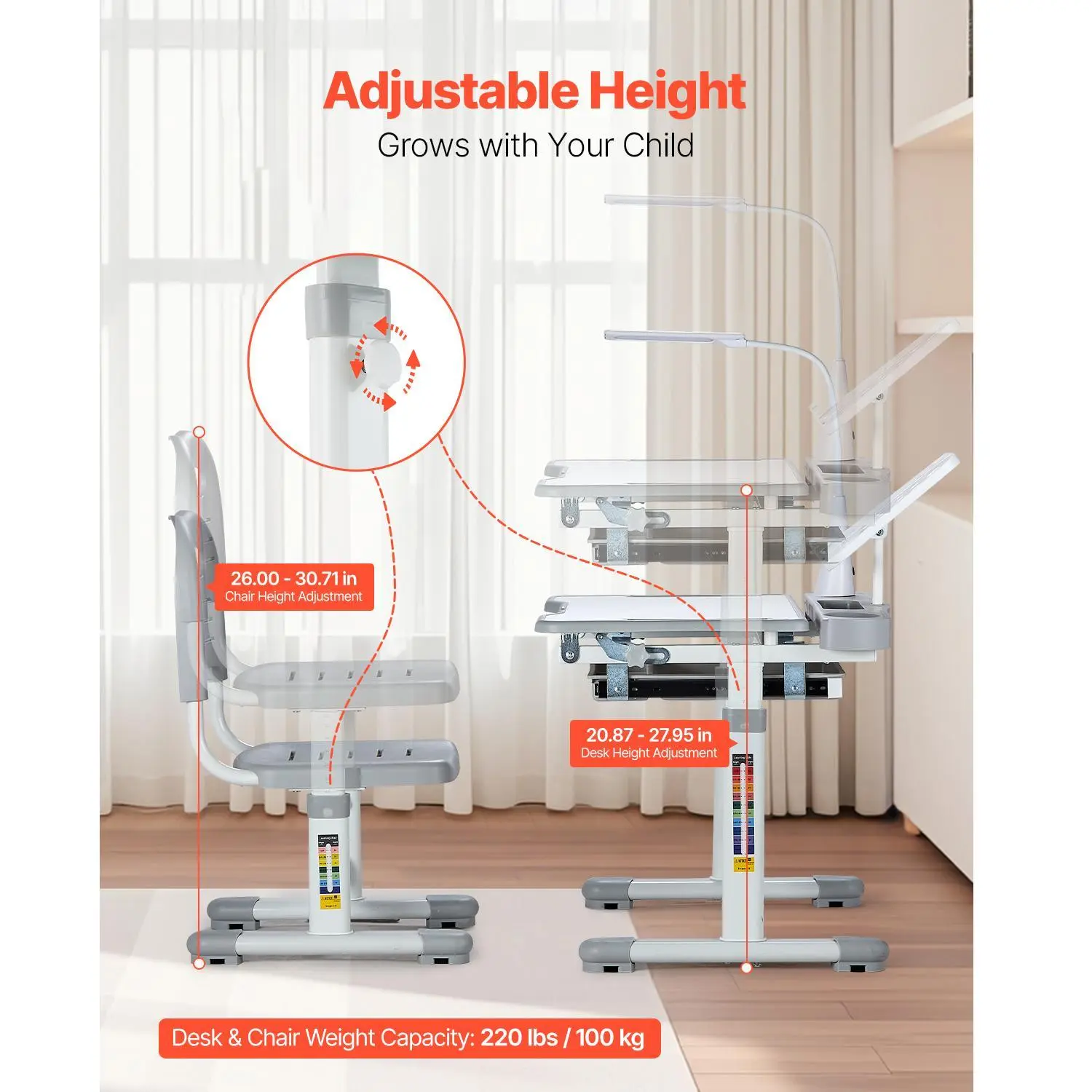 • Flexible Height Adjustment: Easily adjust the heights of the desk and chair to accommodate your child's growth. Parents can effortlessly modify both to ensure your child always maintains a comfortable and supportive learning posture.