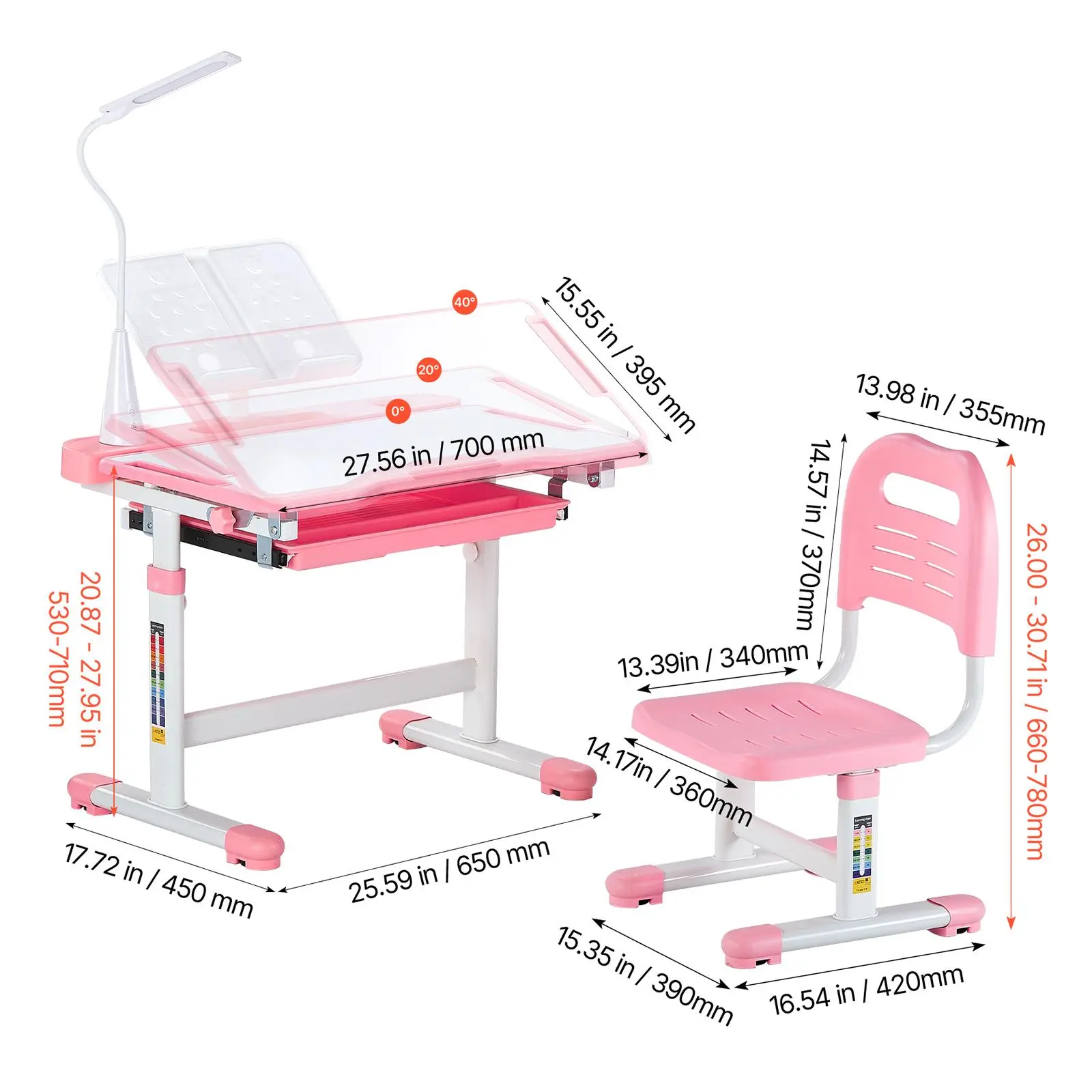 • Adjustable Desktop: Easily tilt the tabletop from 0° to 40°—ideal for writing at 0°, reading at 20°, or drawing at 40°. This flexibility meets various learning activities while helping your child maintain a healthy posture and stay comfortable during study time.