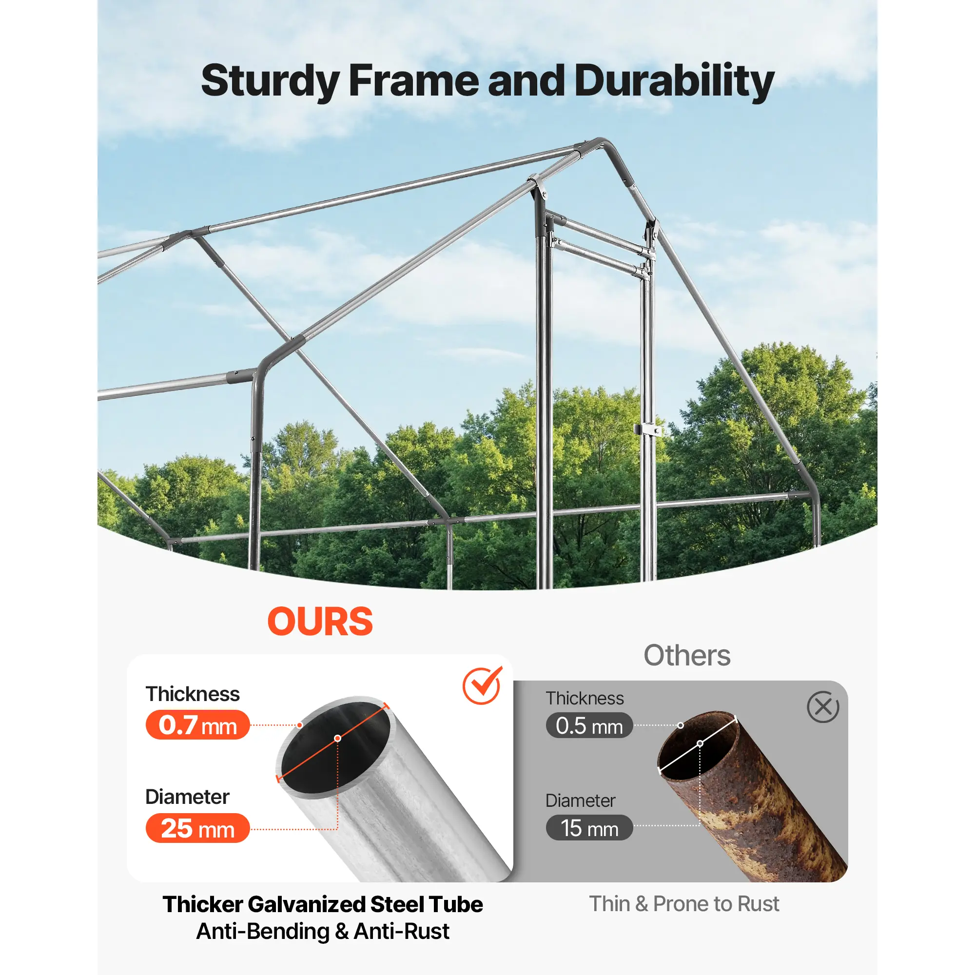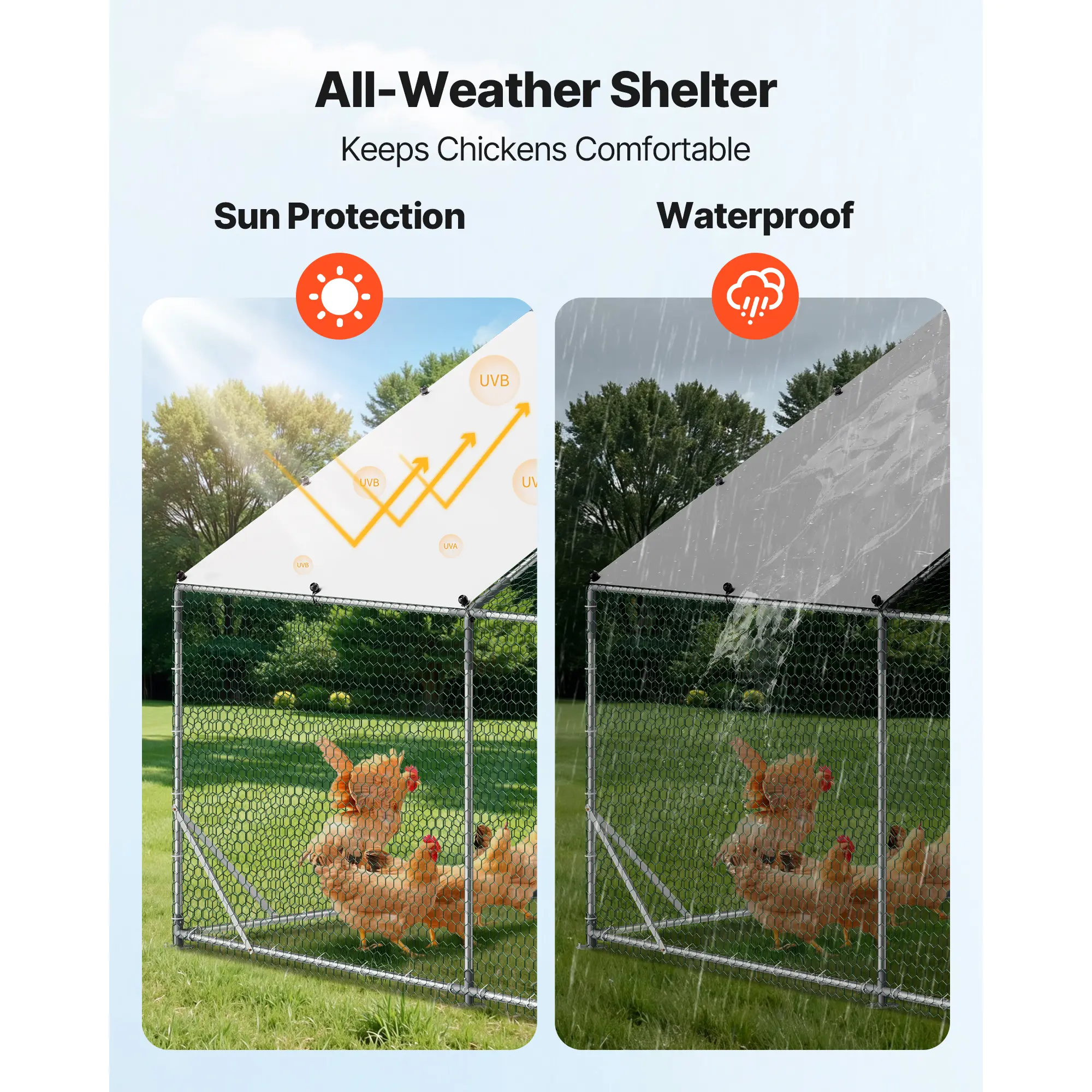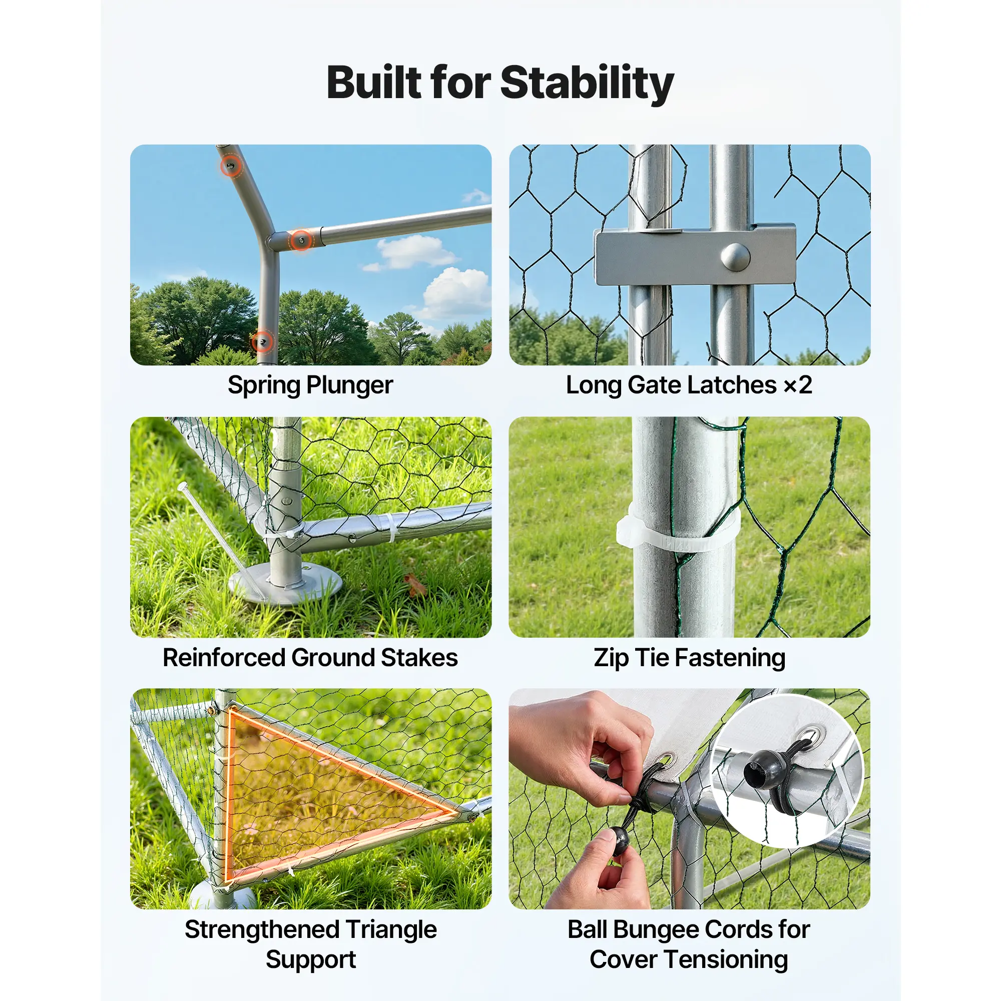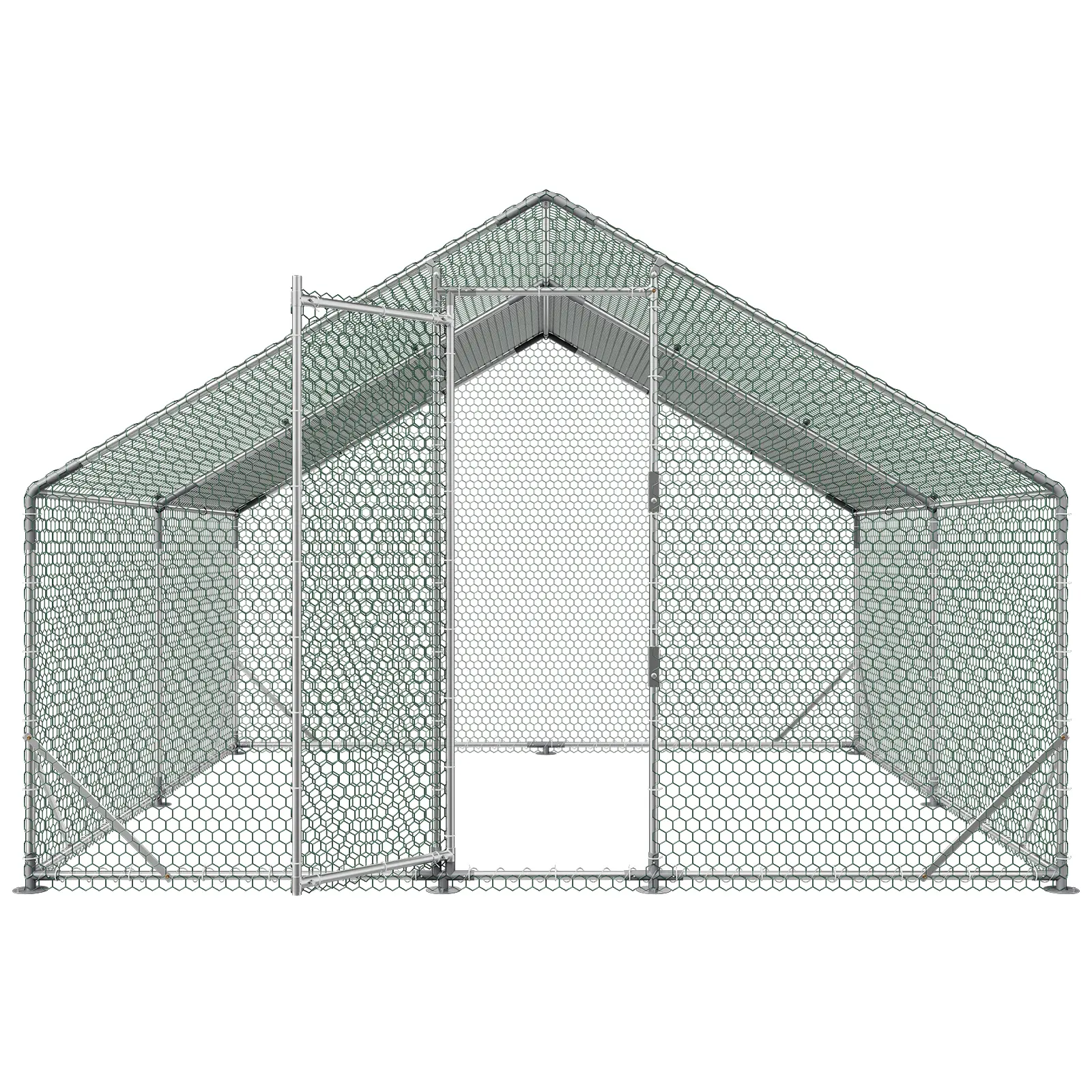 β’ Reinforced Galvanized Steel Frame: Made from corrosion-resistant galvanized steel and anchored with ground stakes for stability. This chicken run is built to withstand strong winds, heavy snow, and harsh weather for long-lasting durability