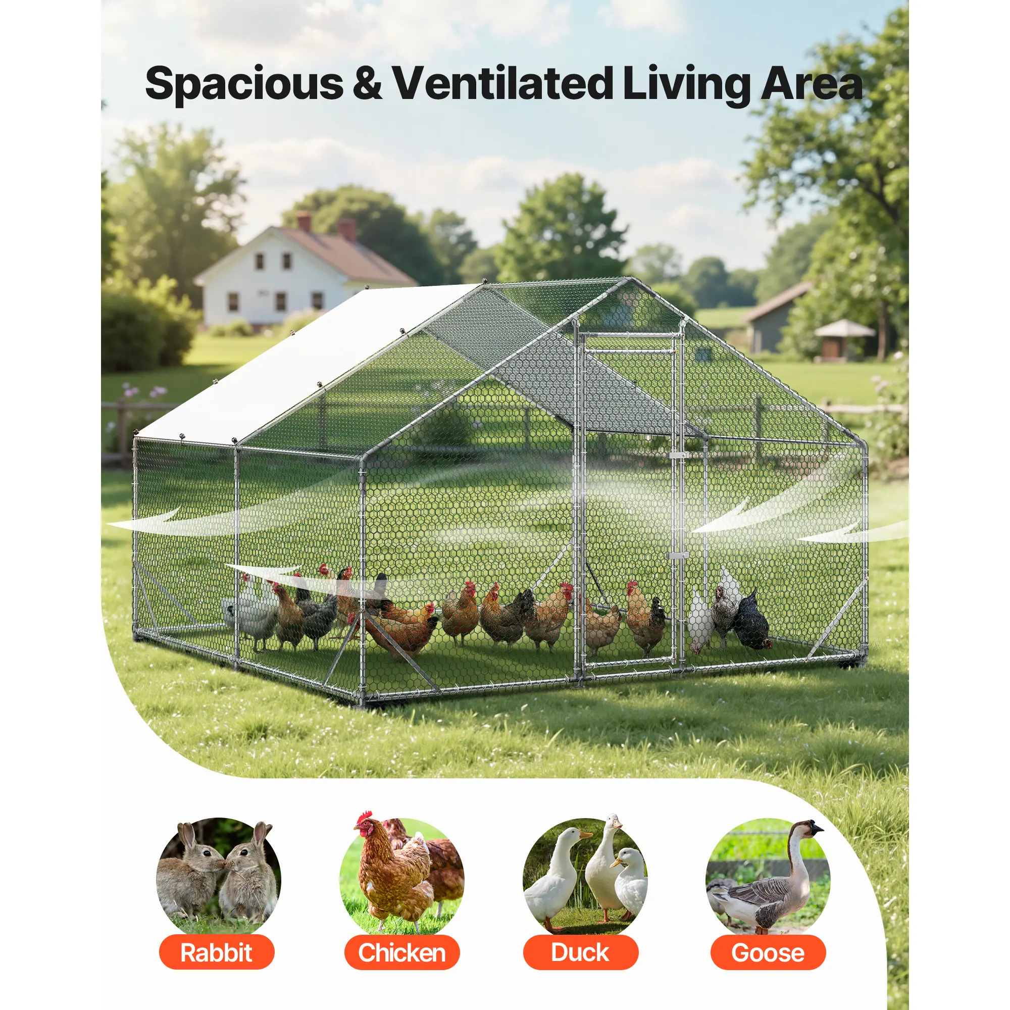 β’ Spacious Walk-In Design: The large chicken coop comes with generous interior that allows chickens to move freely. High-top design provides easy access for feeding and cleaning. Open mesh walls ensure excellent ventilation. Suitable for ducks and rabbits